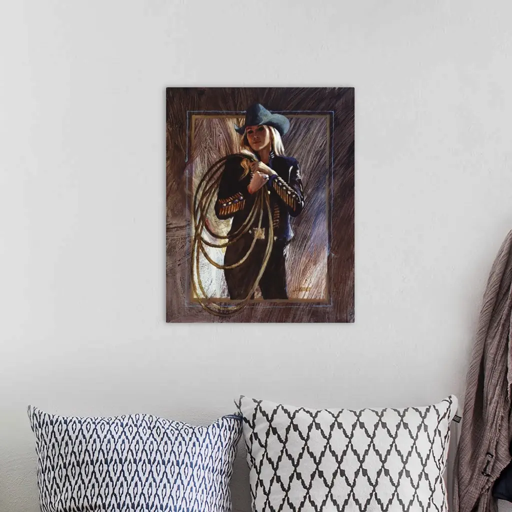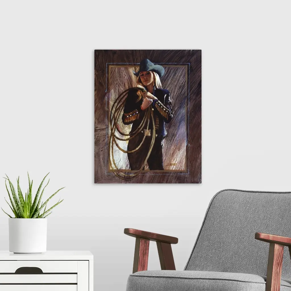 Contemporary western theme painting of a cowgirl in black holding a lasso up.