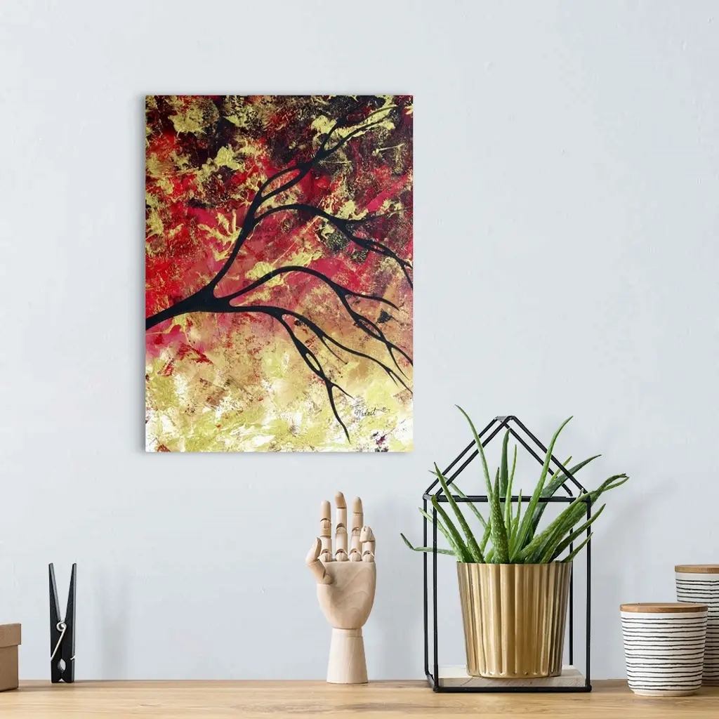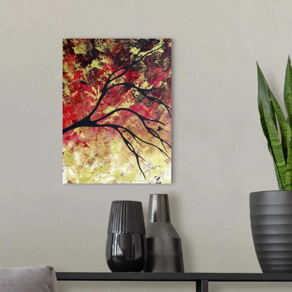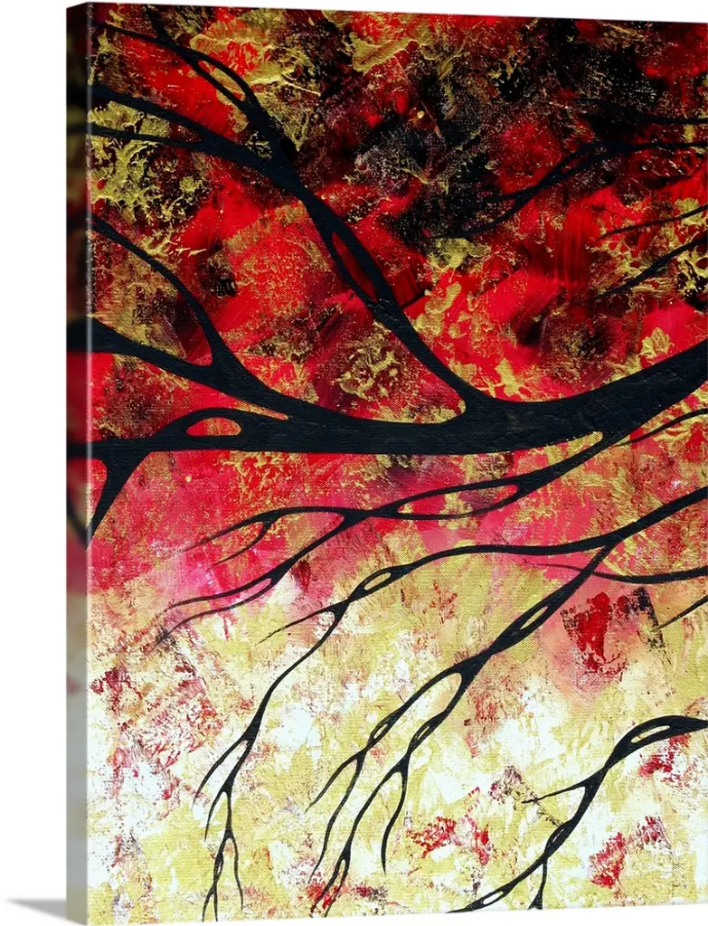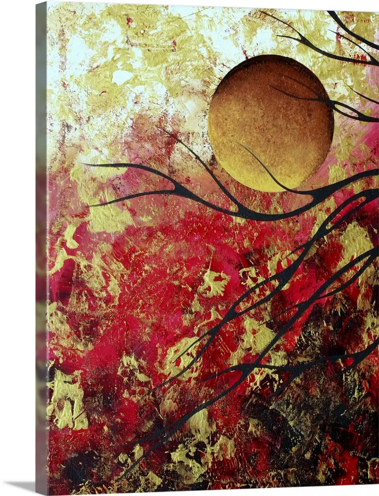 Beautiful metallic gold texture brings brilliance and shine to this Huge original abstract landscape painting. ?Shades of rust, tan and crimson red are the perfect combination to compliment any home decor. The deep golden halo of the distant moon contrasted against the black silhouette of a barren tree creates drama and passion in this contemporary artwork.�