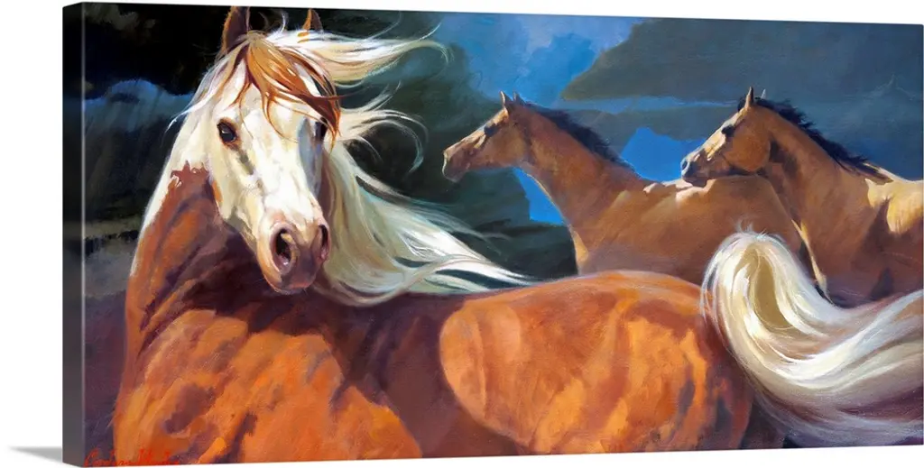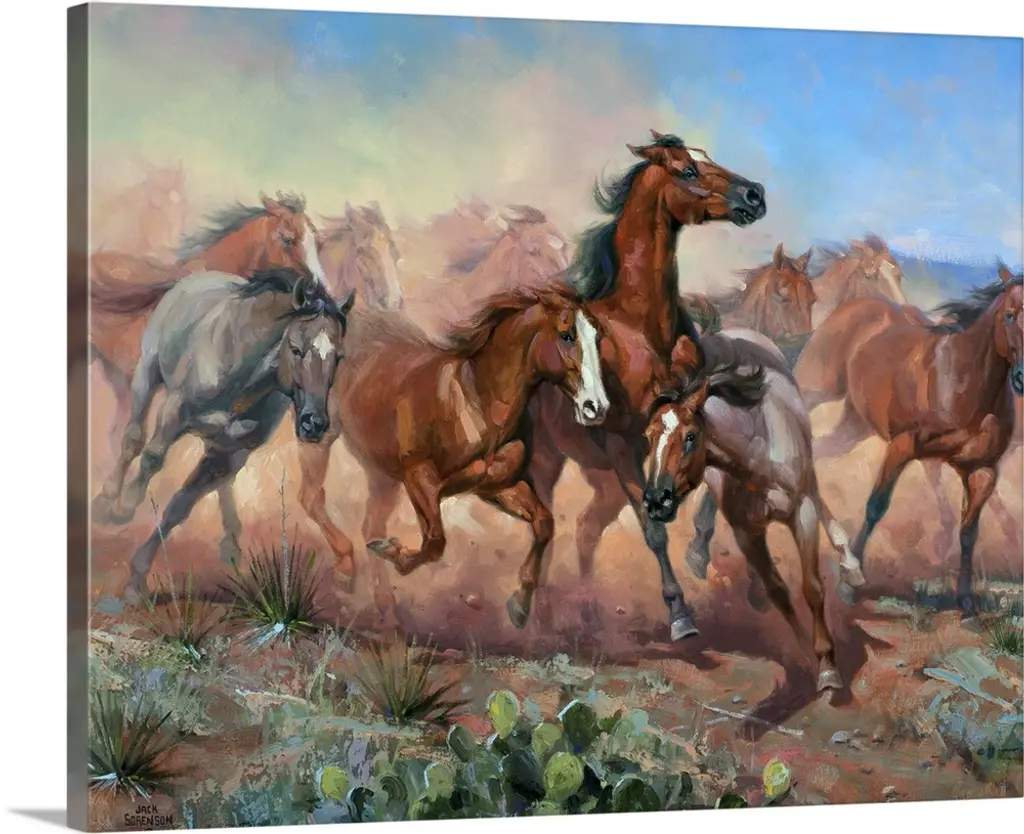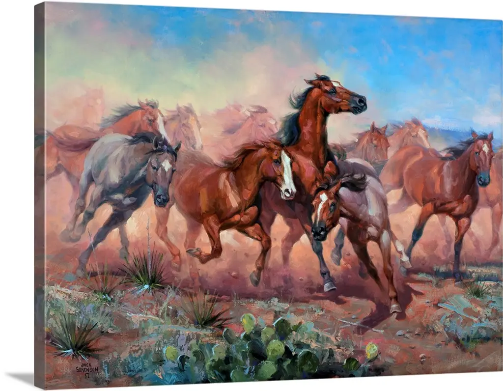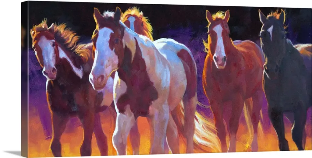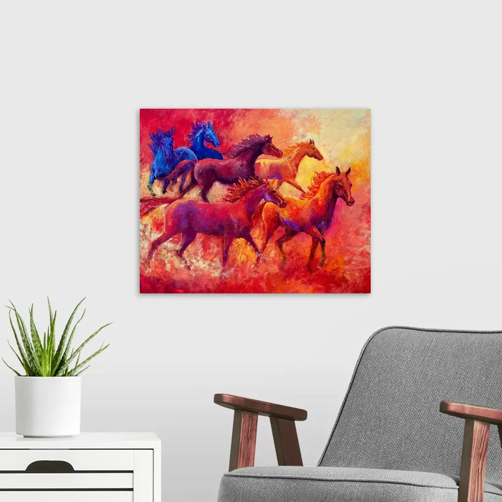 Landscape, large contemporary painting of a group of six horses running together in the same direction. Painted with short, textured brushstrokes in a variety of vibrant colors making the background appear as though it is on fire.