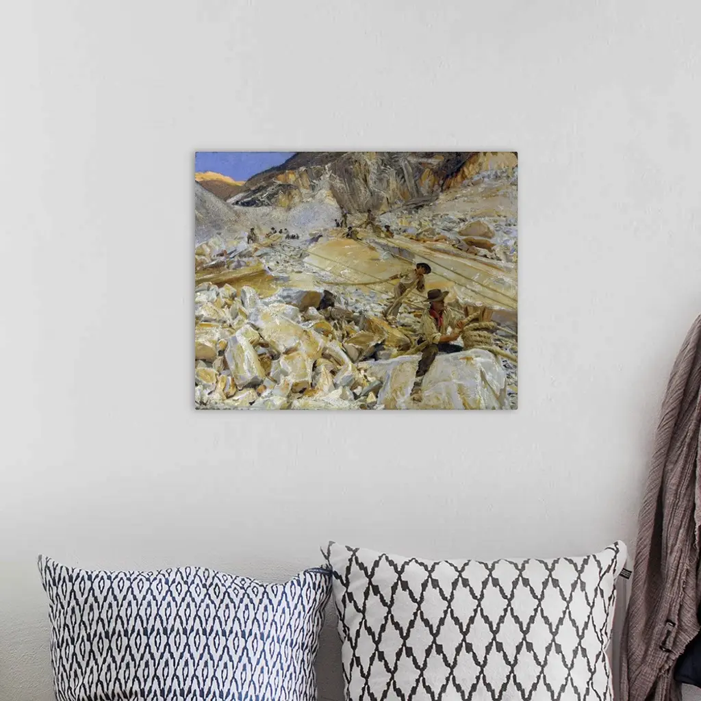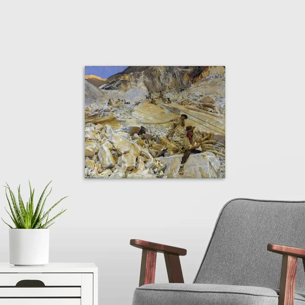 Sargent consolidated many on-the-spot studies of workers into this depiction of the grueling labor, conducted without modern technology, at the historic Italian quarries. A friend recalled the artist's devotion to the subject: While painting at the Carrara marble quarries, [Sargent] slept for weeks in a hut so completely devoid of all ordinary comforts that his companions, far younger men, fled after a few days, unable to stand the Spartan rigors tolerated by their senior with such serene indifference.