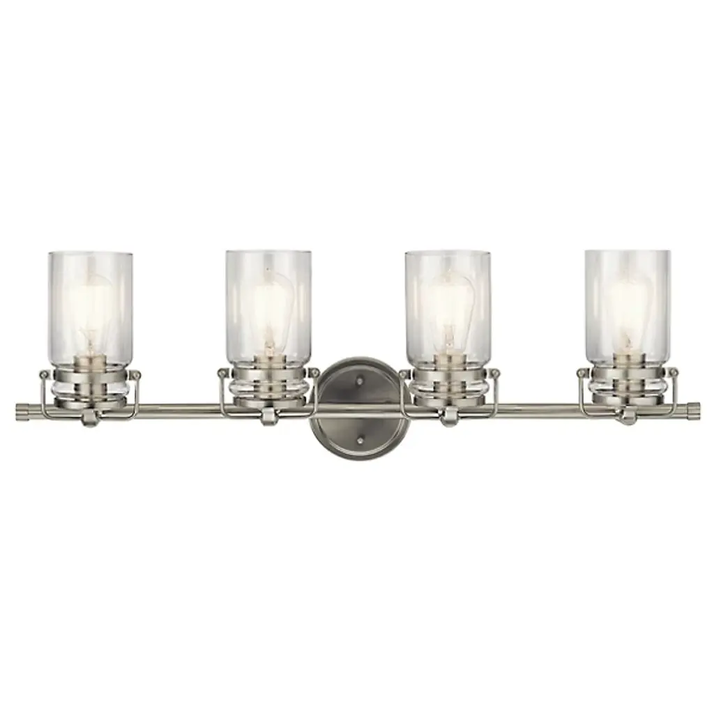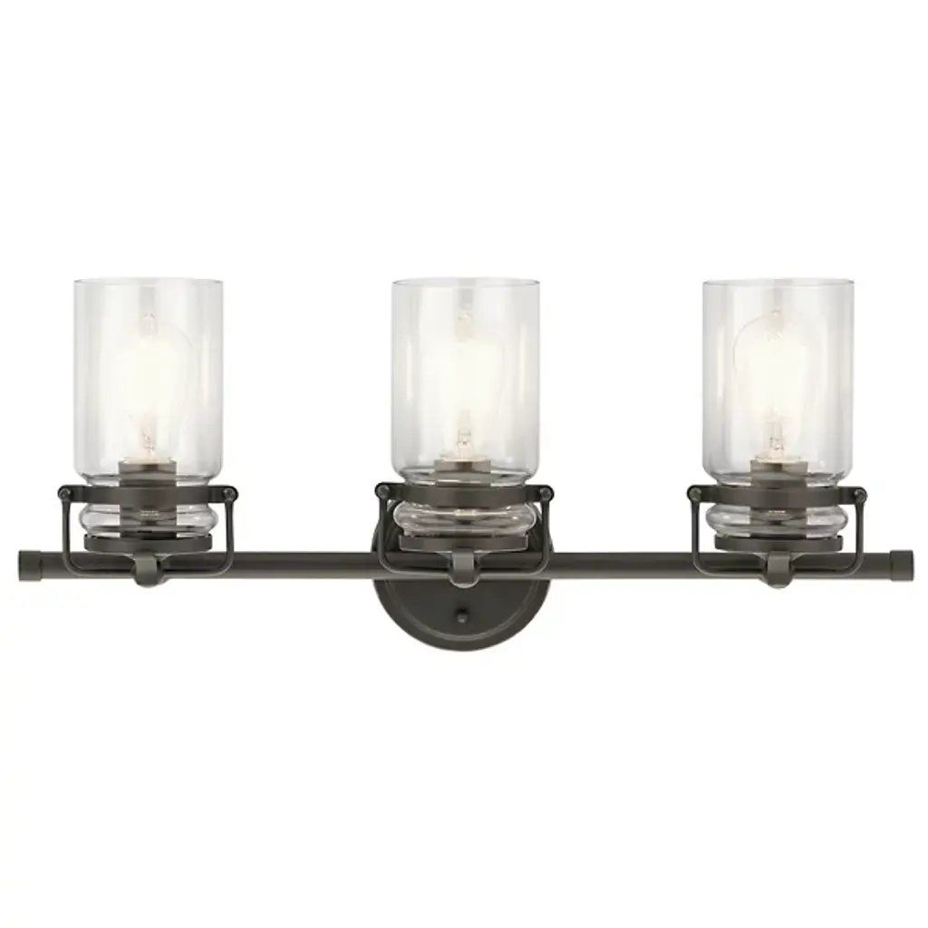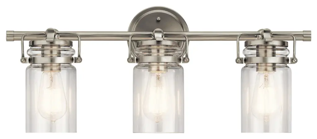 Accentuate the vanity in your modern bathroom with the Brinley Vanity Light from Kichler. Made of smooth metal, this piece rests directly against the wall, starting with a round backplate. The lengthy horizontal arm mounts a set of mason jar-styled shade containers that each house a downward-facing bulb. Subtle and complex details connect the jars to the arm. The light from the bulbs is bright and even, expressing a welcoming layer that spreads throughout the room. The Champagne Bronze finish offers a warm, muted brushed gold style and pairs beautifully with coordinating Delta® plumbing fixtures by Delta Faucet.