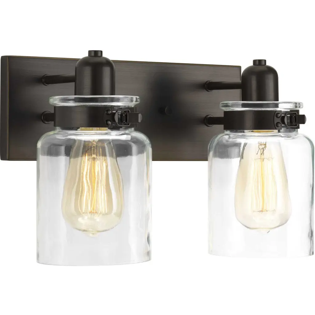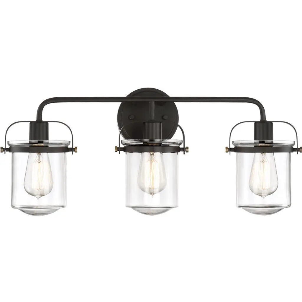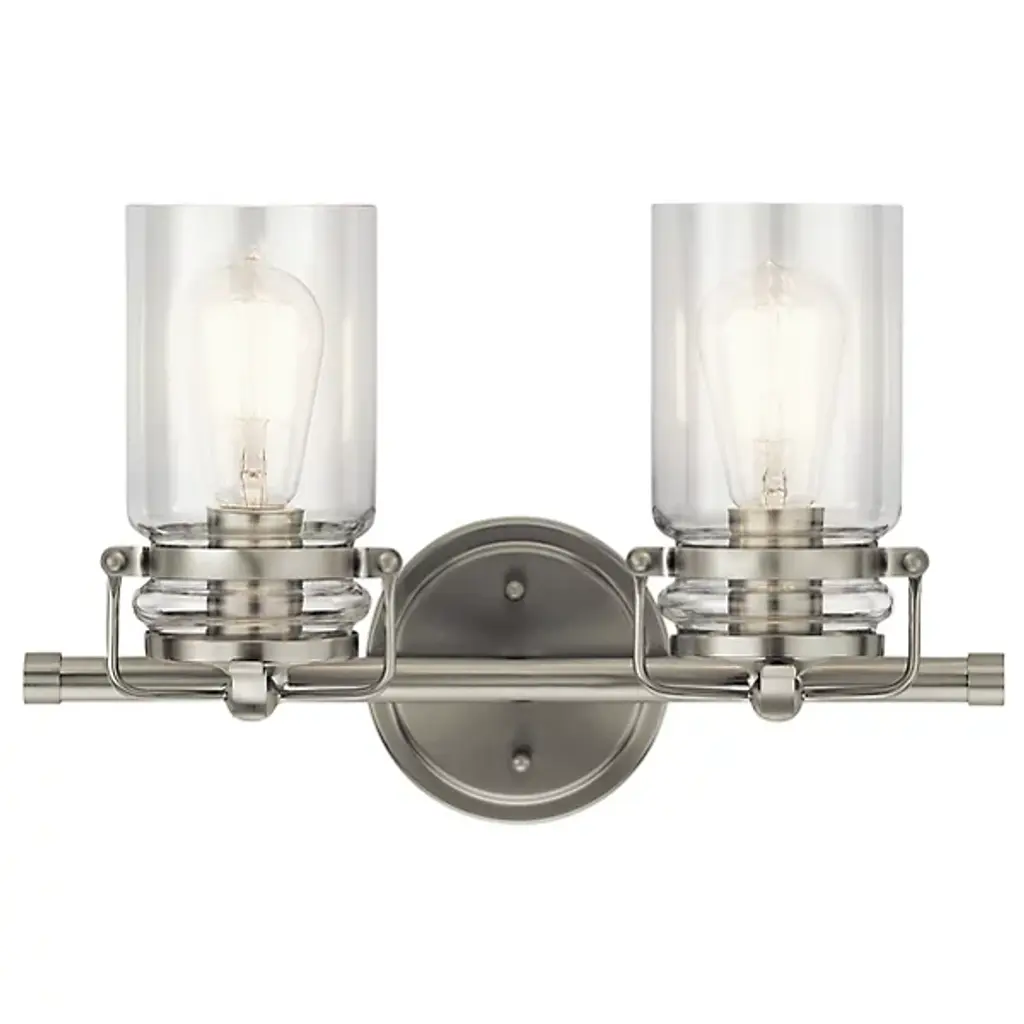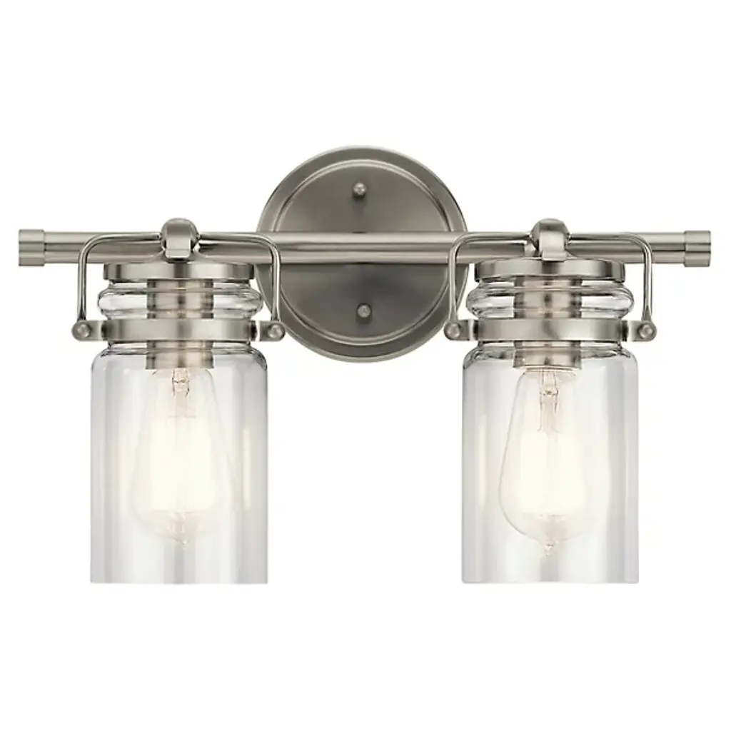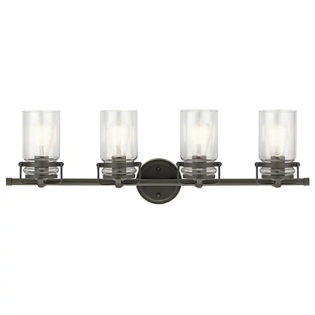 Accentuate the vanity in your modern bathroom with the Brinley Vanity Light from Kichler. Made of smooth metal, this piece rests directly against the wall, starting with a round backplate. The lengthy horizontal arm mounts a set of mason jar-styled shade containers that each house a downward-facing bulb. Subtle and complex details connect the jars to the arm. The light from the bulbs is bright and even, expressing a welcoming layer that spreads throughout the room. The Champagne Bronze finish offers a warm, muted brushed gold style and pairs beautifully with coordinating Delta® plumbing fixtures by Delta Faucet.