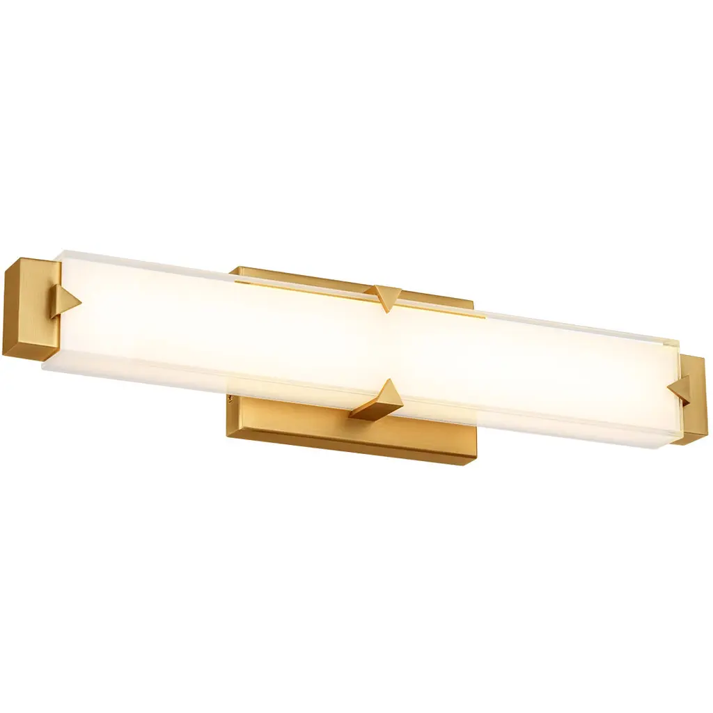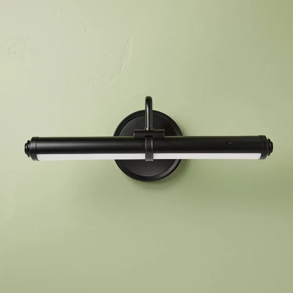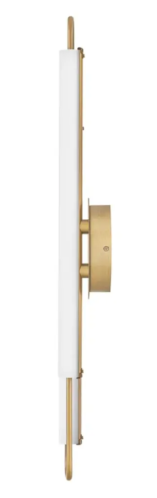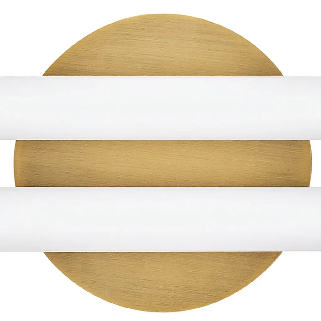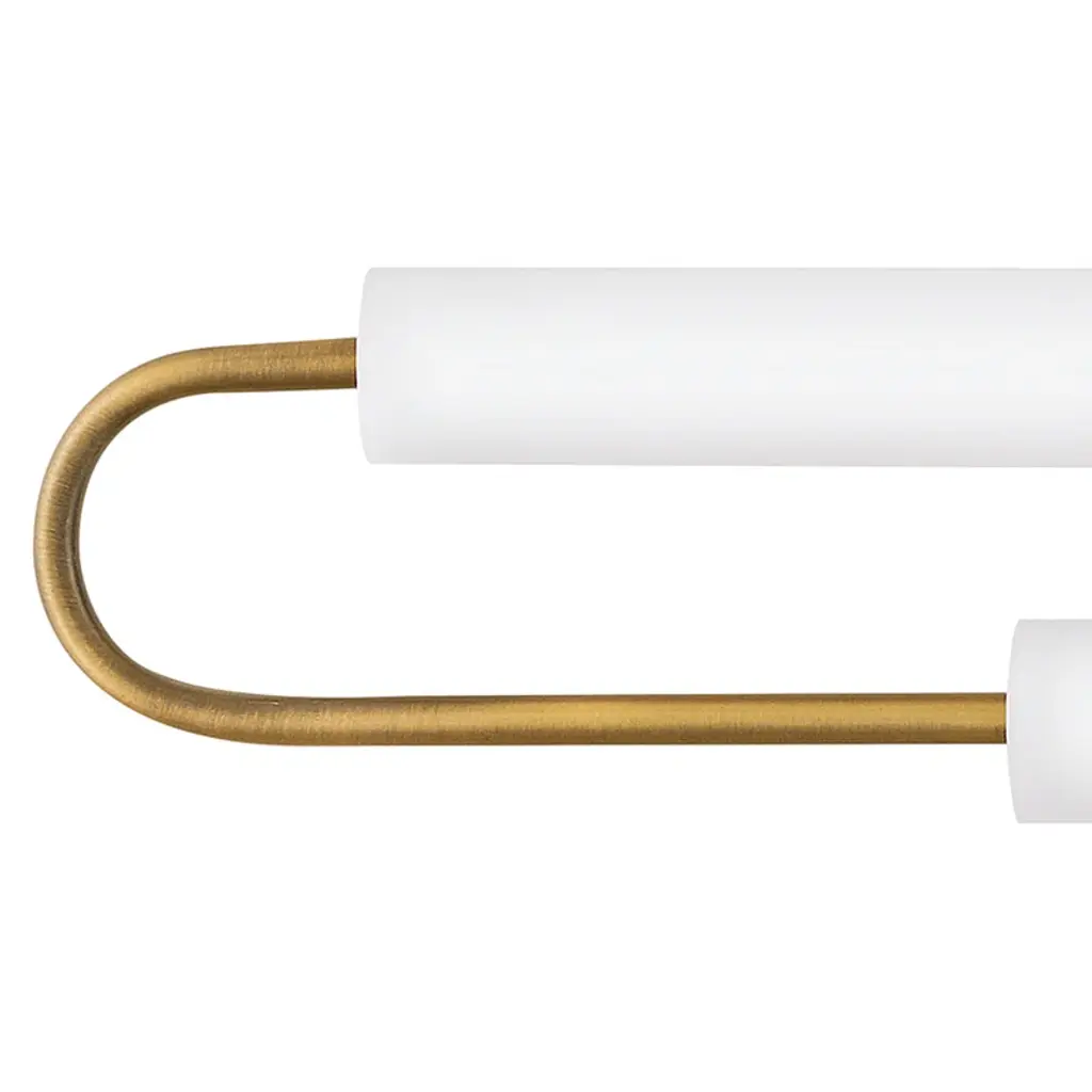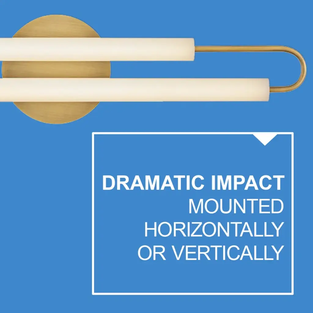 Contemporary and clean, this integrated LED bath vanity light's style is a unique addition to bathrooms, en suites, and powder rooms. Offset milky etched glass tubes are striking paired with any of the four complementary finishes: Black, Brushed Nickel, Chrome, and Lacquered Brass. Illuminated by an energy-efficient integrated LED unit, this light fixture is not only dimmable but can be mounted vertically or horizontally, or as a unique wall sconce anywhere in the home.