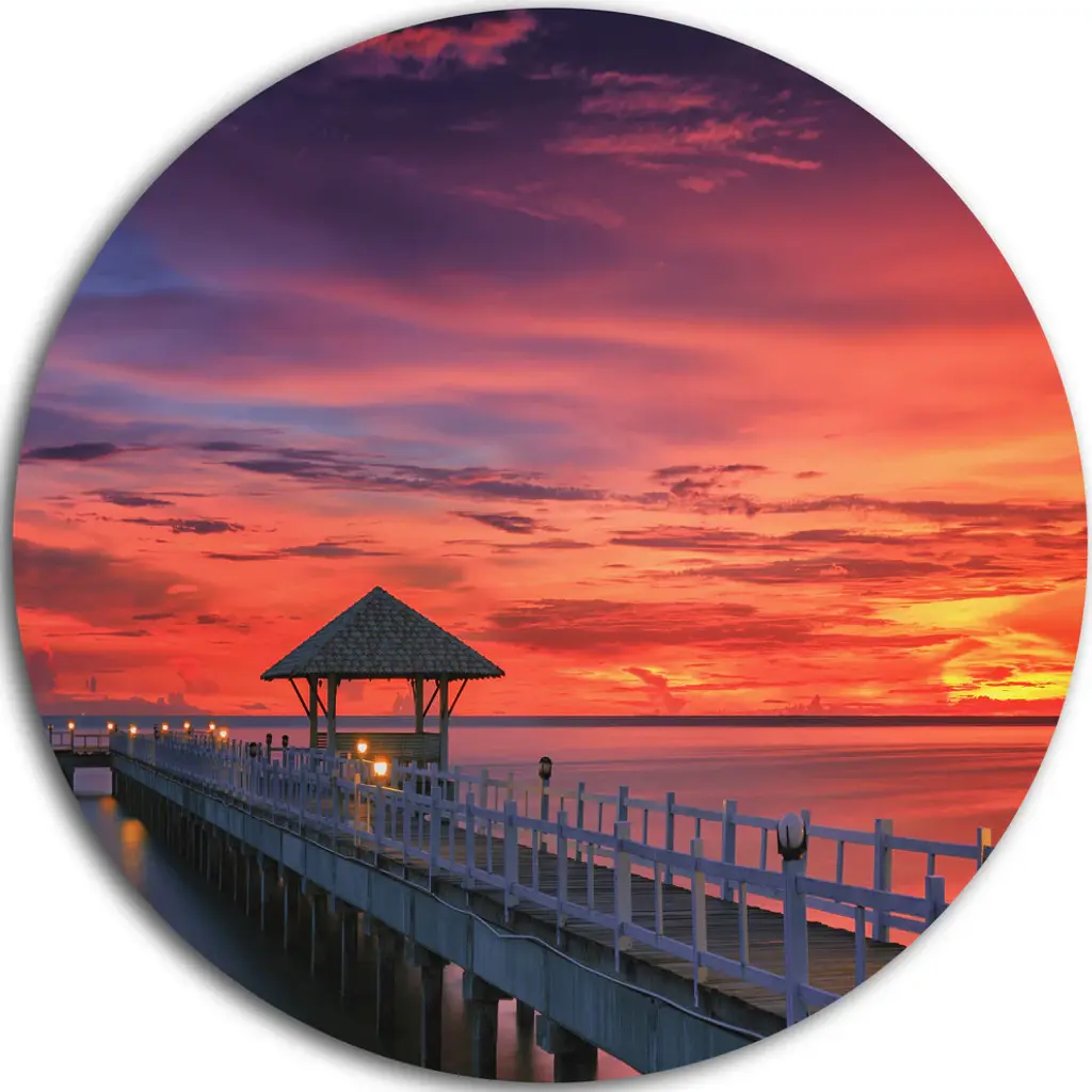 Bring Contemporary Abstraction to your home with this large Circle Metal wall art. This Broken Wooden Bridge at Sunset Metal Artwork makes it the focal point of any room or office. - White Gloss Coating ensures colors are extra vibrant with light reflection.- Aluminum grade Sheet Metal with 1 inch mounting frame on the back giving the illusion that the artwork is floating on the wall..- Mounting Brackets are included along with instructions.- High Quality Digital images are created directly into a glossy aluminum panel producing a stunning and captivating print into the glossy finish of the metal.- Water, Fire and Scratch resistant HD Aluminum panels.- Looks better than any photo paper and guaranteed to last at least 20 years- Easy to clean with a microfiber cloth. Colors are far superior to regular Canvas Art. - Easy to Hang