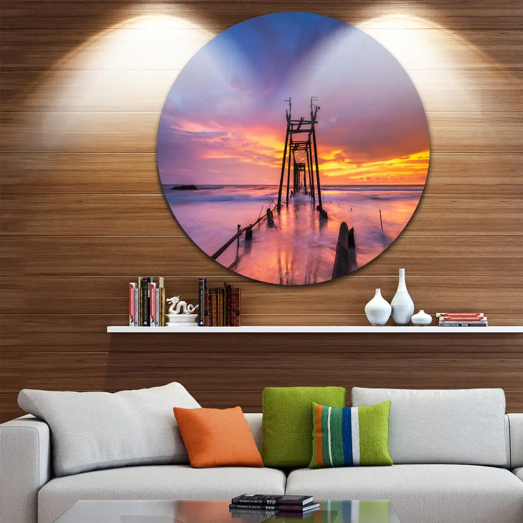 Broken Wooden Bridge At Sunset, Seascape Round Metal Wall Art, 11"