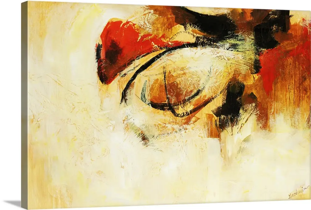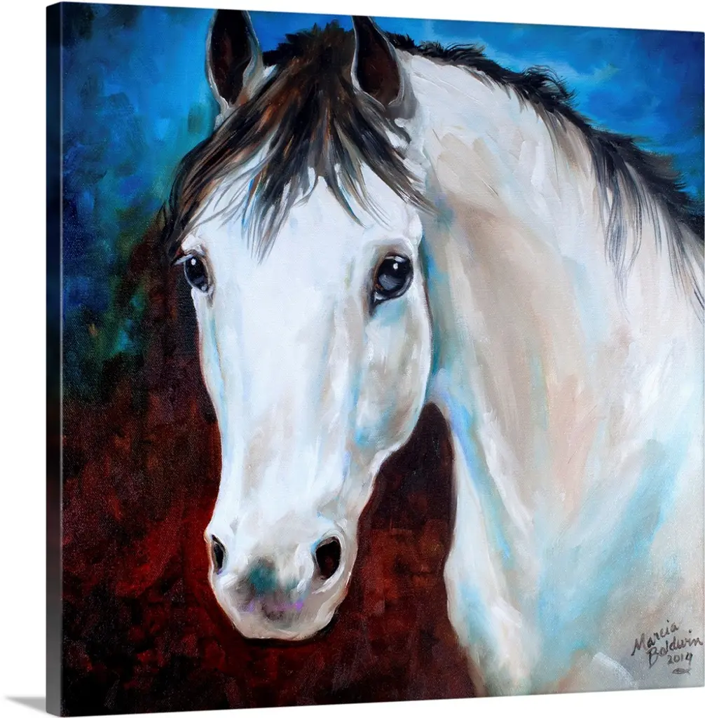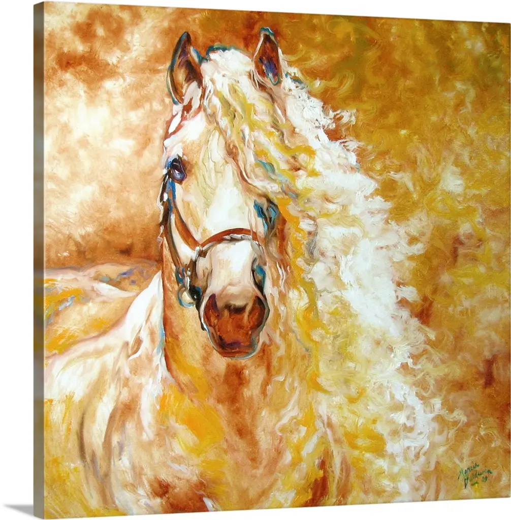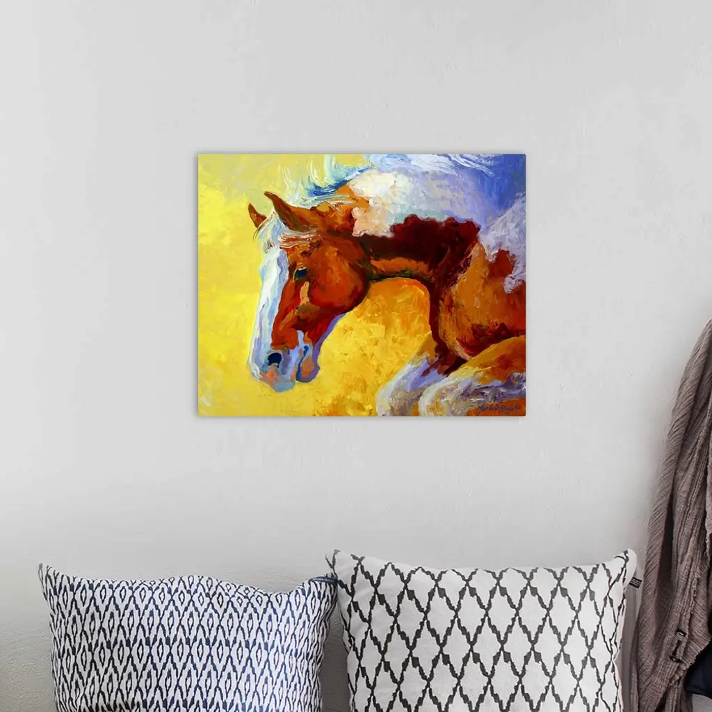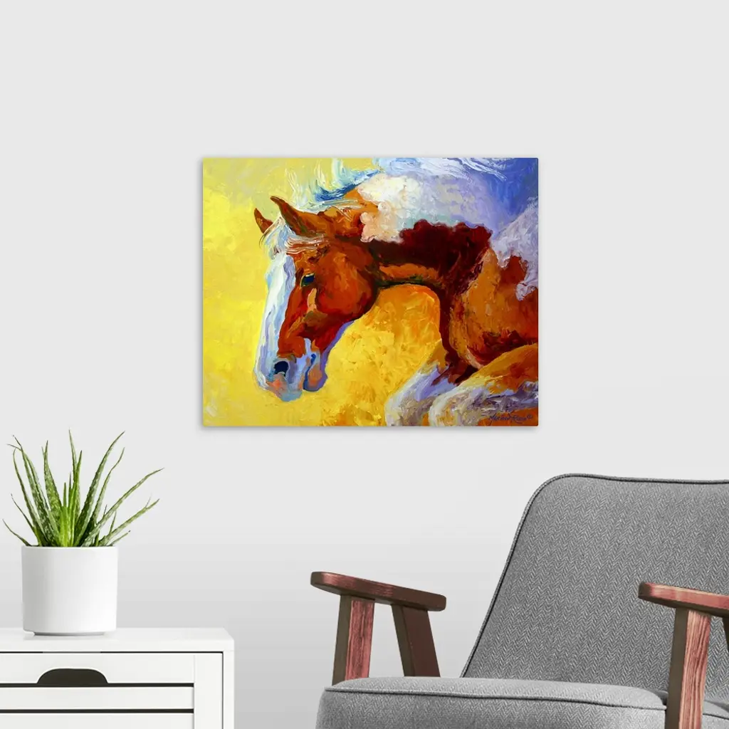 A brightly colored contemporary painting of a charging Paint stallion, his neck arched as he gallops.