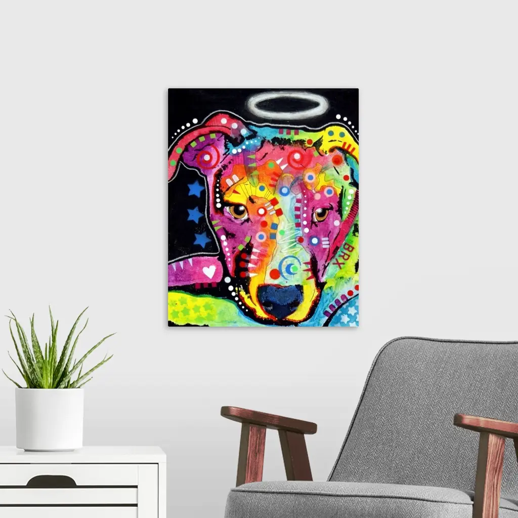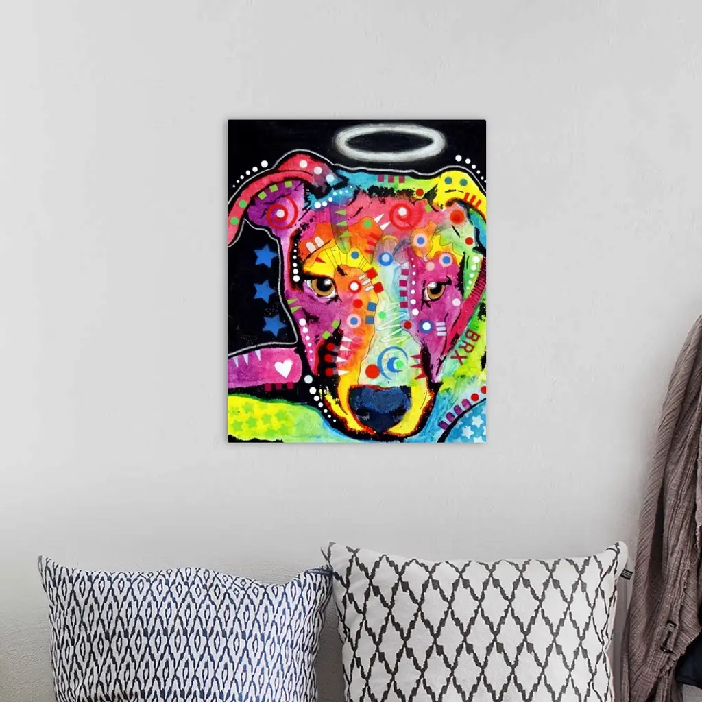 Contemporary stencil painting of a dog filled with various colors and patterns.