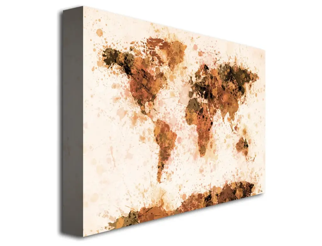 Title: Bronze Paint Splash World MapArtist: Michael TompsettProduct Type: Canvas ArtSize: 30" x 47"Made in the USA.Art and design were always Michael's favorite subjects at school. He was fortunate to land a job as a graphic designer at one of London's most prestigious publishing companies. After 12 years Michael Tompsett made the decision to pursue a full-time career creating his own work. The freedom and time to be able to focus solely on his own projects has been a wonderful experience. Although Michael likes to experiment with different styles and subjects, his main focus is on map art. He enjoys looking for unique and interesting ways to depict something familiar. Maps are visual representations of the world we live in, a world which is incredibly diverse. Apart from maps, Tompsett creates urban landmark and cityscape designs.This 30" x 47" canvas art is ready to hang. Giclee (jee-clay) is an advanced printmaking process for creating high quality fine art reproductions. The attainable excellence that Giclee printmaking affords makes the reproduction virtually indistinguishable from the original piece. The result is wide acceptance of Giclee by galleries, museums, and private collectors. Gallery wrap is a method of stretching an artist's canvas so that the canvas wraps around the sides and is secured to a hidden, wooden frame. This method of stretching and preparing a canvas allows for a frameless presentation of the finished print.