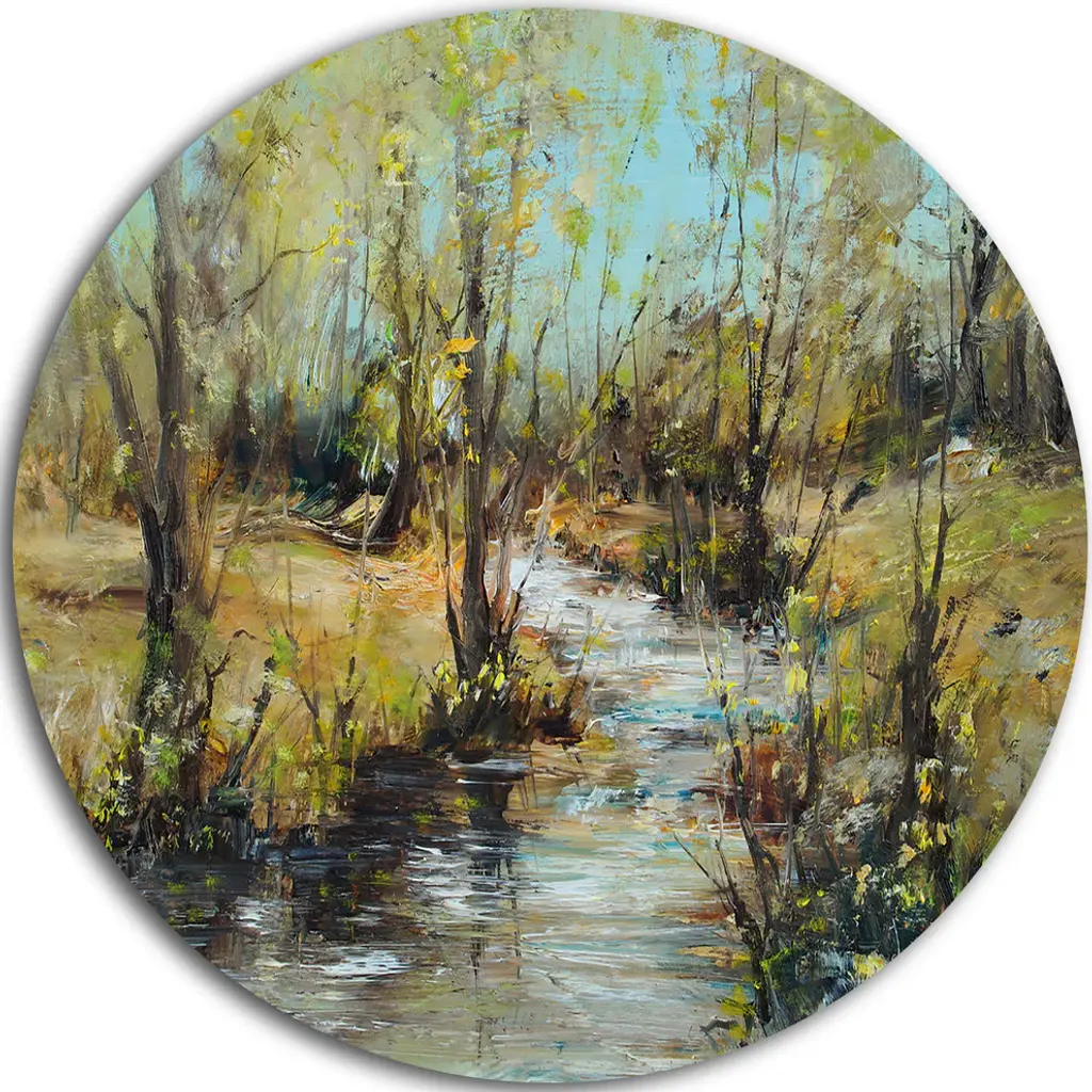 Bring Contemporary Abstraction to your home with this large Circle Metal wall art. This Brook and Rocks Oil Painting Metal Artwork makes it the focal point of any room or office. - White Gloss Coating ensures colors are extra vibrant with light reflection.- Aluminum grade Sheet Metal with 1 inch mounting frame on the back giving the illusion that the artwork is floating on the wall..- Mounting Brackets are included along with instructions.- High Quality Digital images are created directly into a glossy aluminum panel producing a stunning and captivating print into the glossy finish of the metal.- Water, Fire and Scratch resistant HD Aluminum panels.- Looks better than any photo paper and guaranteed to last at least 20 years- Easy to clean with a microfiber cloth. Colors are far superior to regular Canvas Art. - Easy to Hang