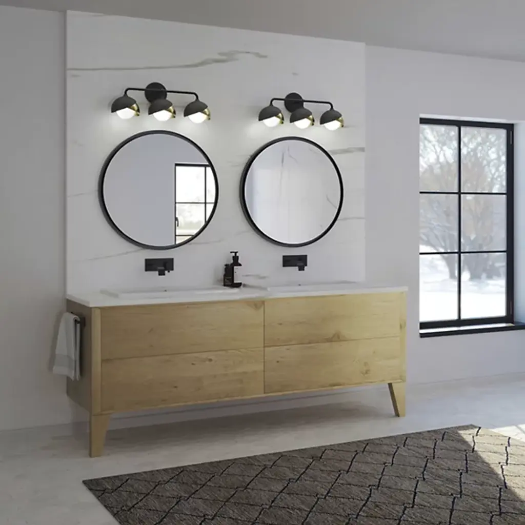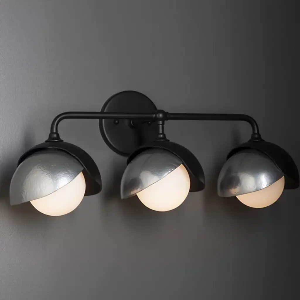 The Brooklyn 3-Light Double Shade Vanity Light design by Hubbardton Forge amplifies the very best parts of your home. Our artisans took curvature to the next level, making a double lid-like shade the center point of this vanity light fixture. Three unique, forged-steel shades sit at the end of a slim curved rod, adding depth and illusion as a sizeable orb globe sits in the middle. Mount this unique double shade vanity light in your bathroom for optimal illumination.