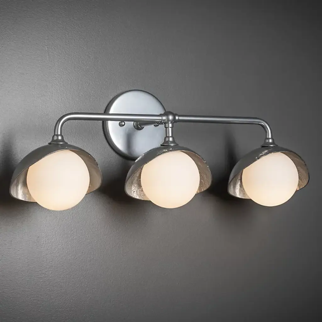 Take a sophisticated approach to design with the Brooklyn 3-Light Single Shade Vanity Light by Hubbardton Forge. Our artisans took curvature to the next level, making a single lid-like shade the center point of this vanity light fixture. Three unique, forged-steel shades sit at the end of a slim curved rod attached to a circular base, adding depth and illusion to the sizeable orb globe that sits in the middle. Install this beautiful vanity fixture in your bathroom for optimal illumination.