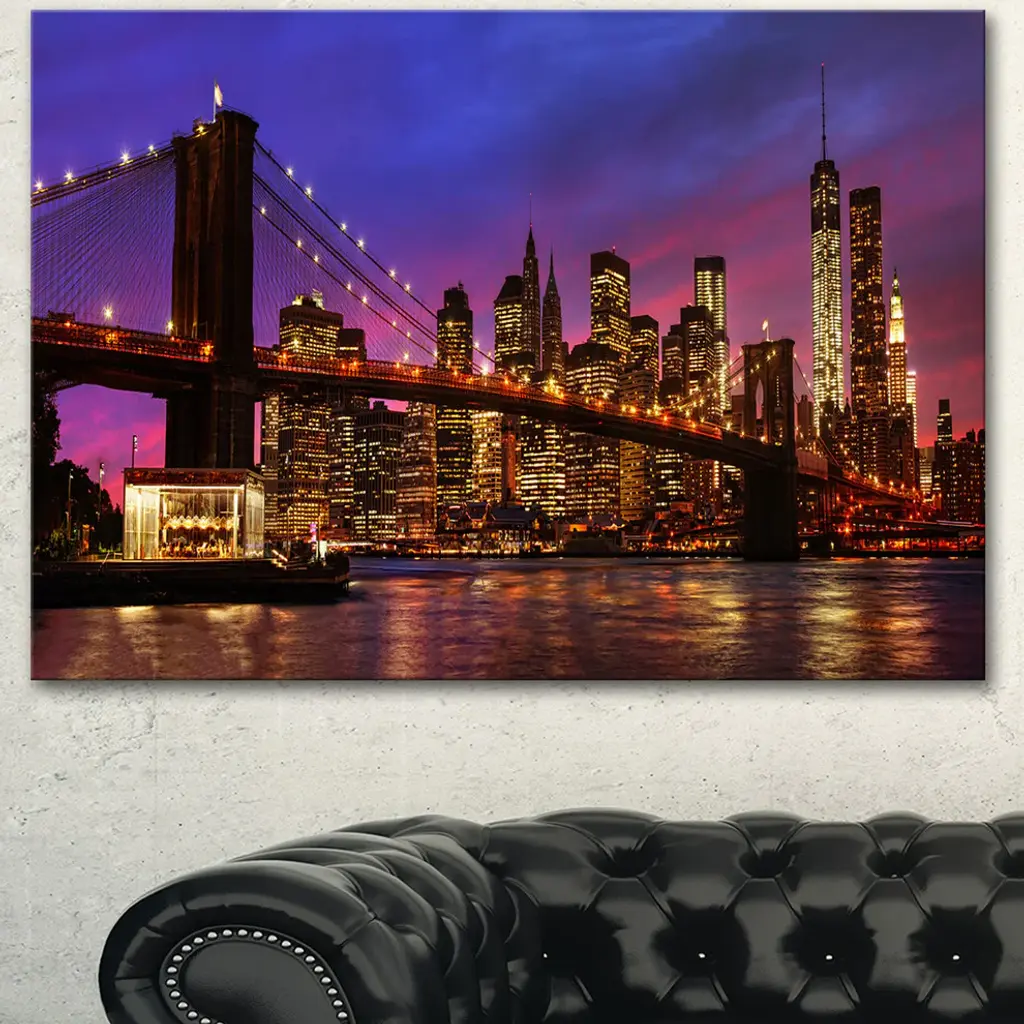 Brooklyn Bridge And Manhattan At Sunset, Pink, Canvas Art Print, 60"x28"