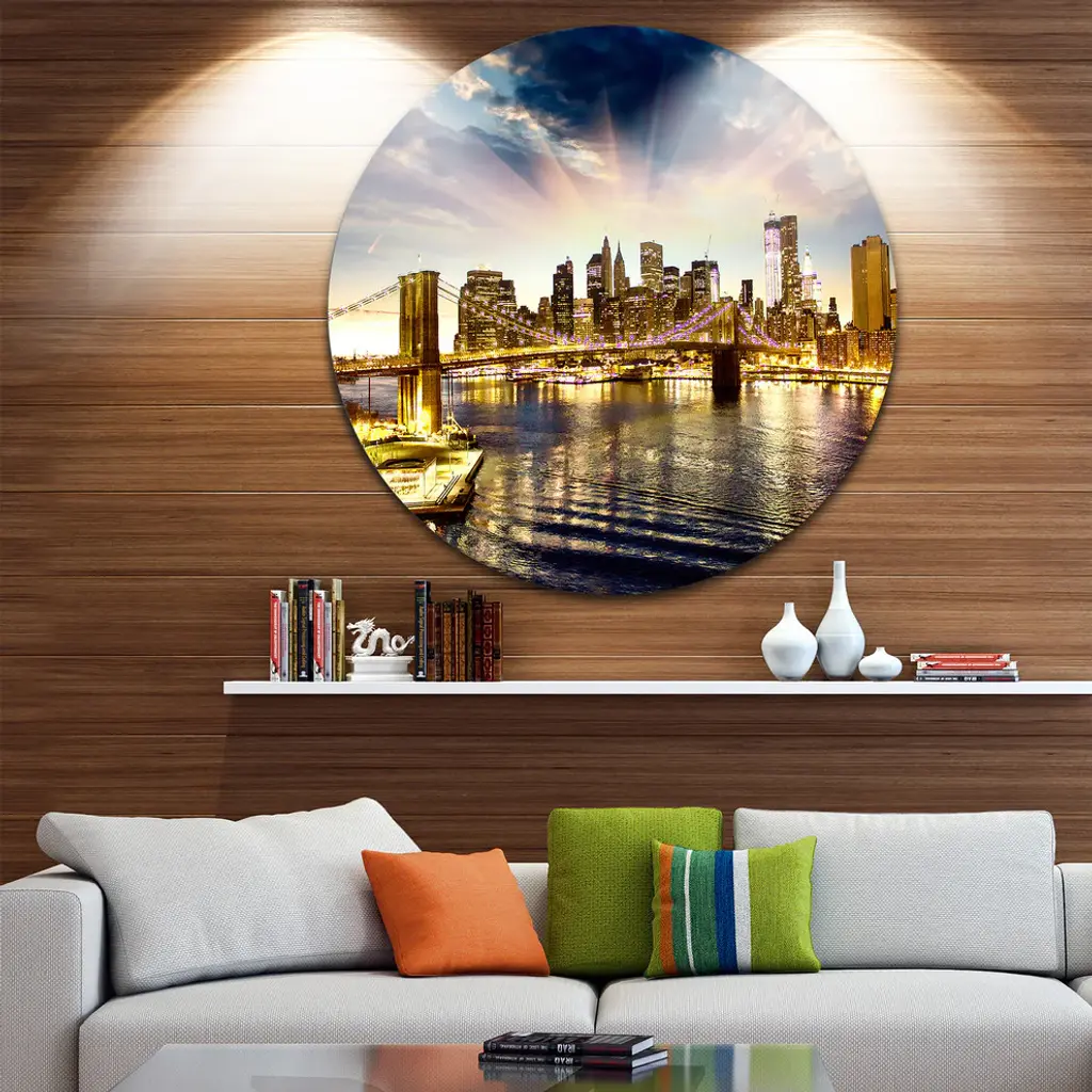 Bring Contemporary Abstraction to your home with this large Circle Metal wall art. This Brooklyn Bridge and Manhattan Skyline Metal Artwork makes it the focal point of any room or office. - White Gloss Coating ensures colors are extra vibrant with light reflection.- Aluminum grade Sheet Metal with 1 inch mounting frame on the back giving the illusion that the artwork is floating on the wall..- Mounting Brackets are included along with instructions.- High Quality Digital images are created directly into a glossy aluminum panel producing a stunning and captivating print into the glossy finish of the metal.- Water, Fire and Scratch resistant HD Aluminum panels.- Looks better than any photo paper and guaranteed to last at least 20 years- Easy to clean with a microfiber cloth. Colors are far superior to regular Canvas Art. - Easy to Hang