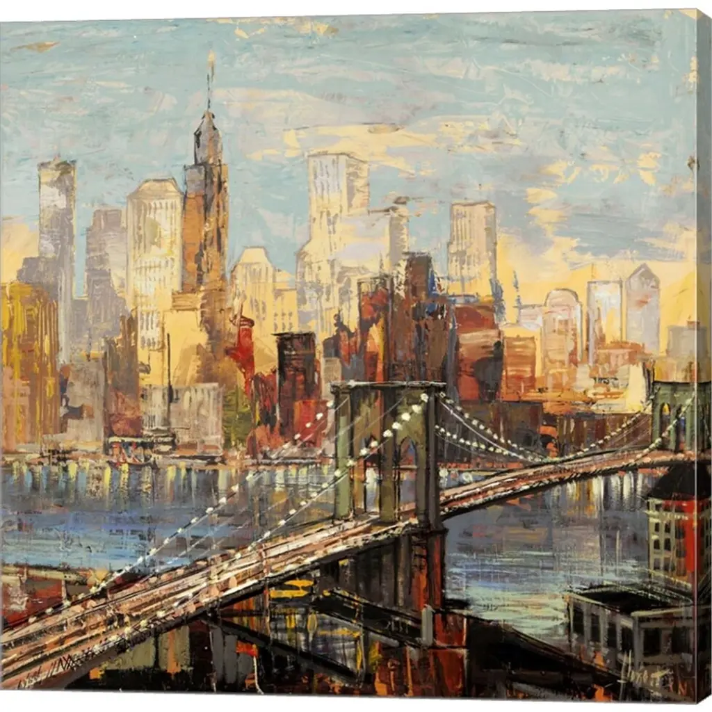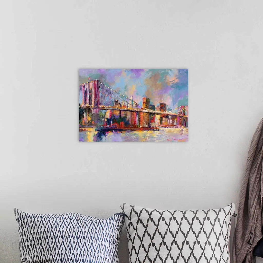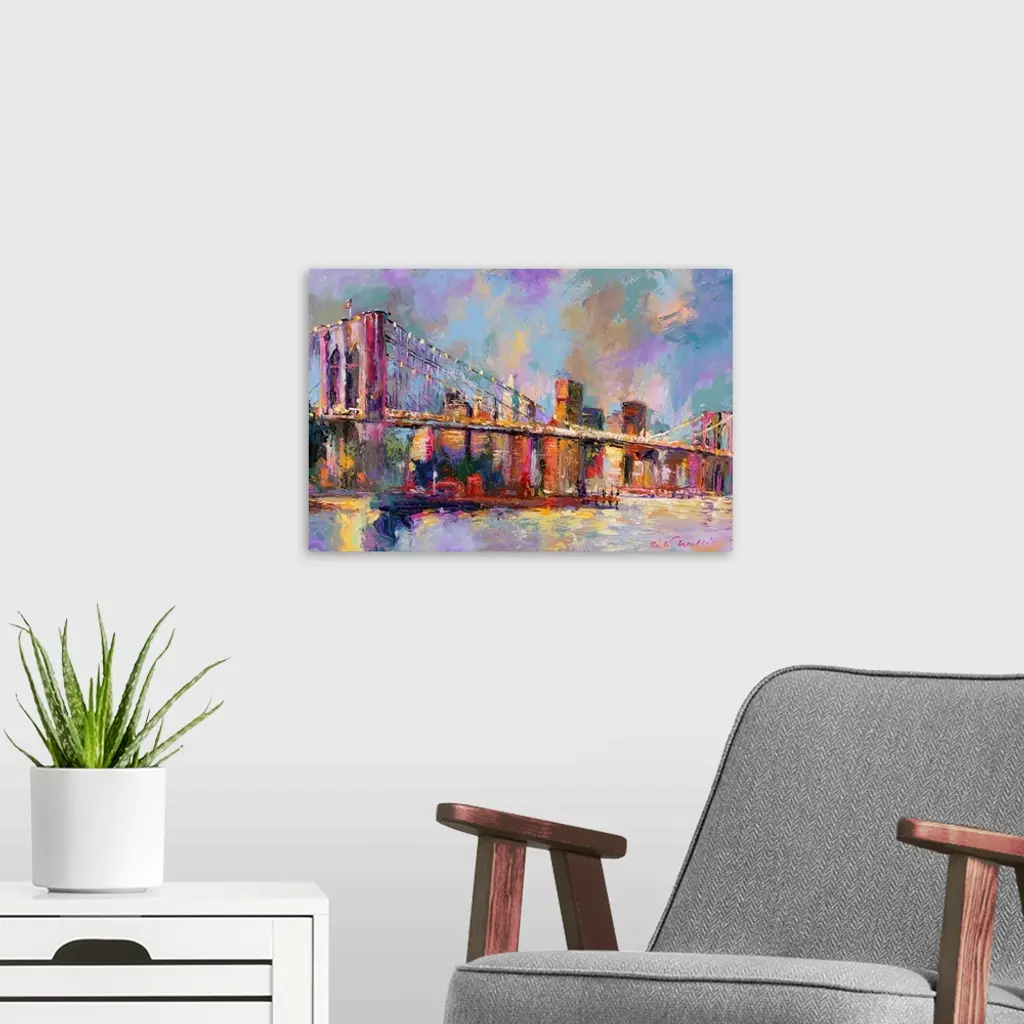 Colorful abstract painting of the Brooklyn Bridge and the NYC skyline in the distance.