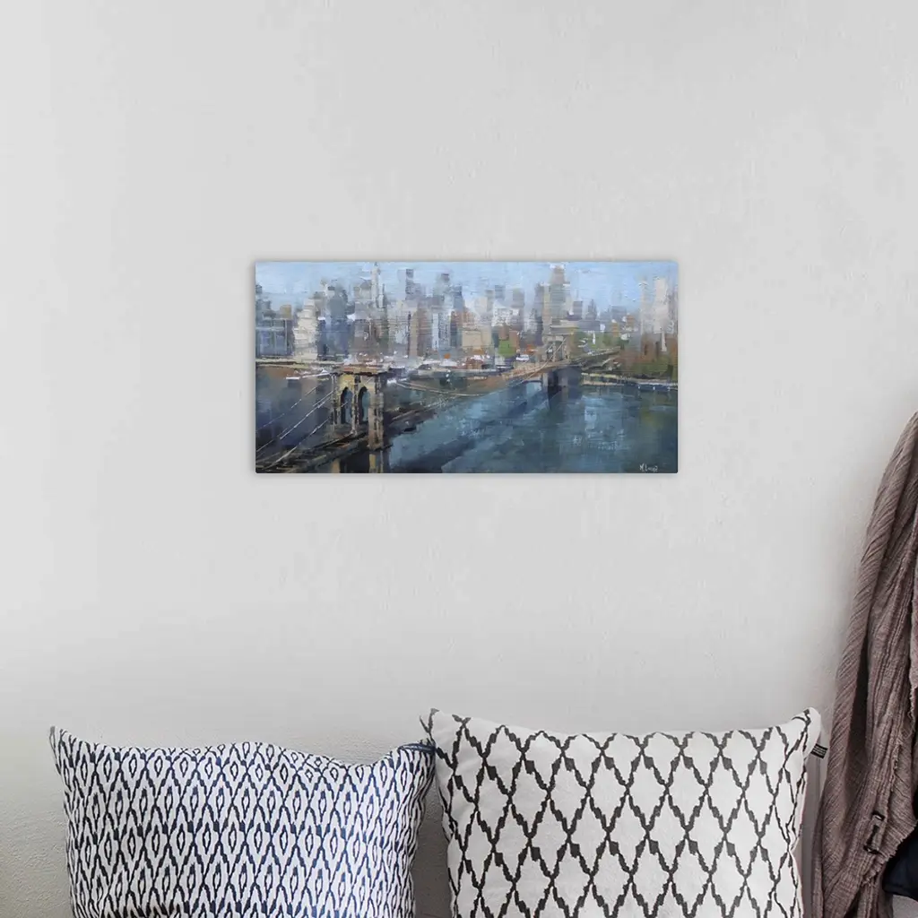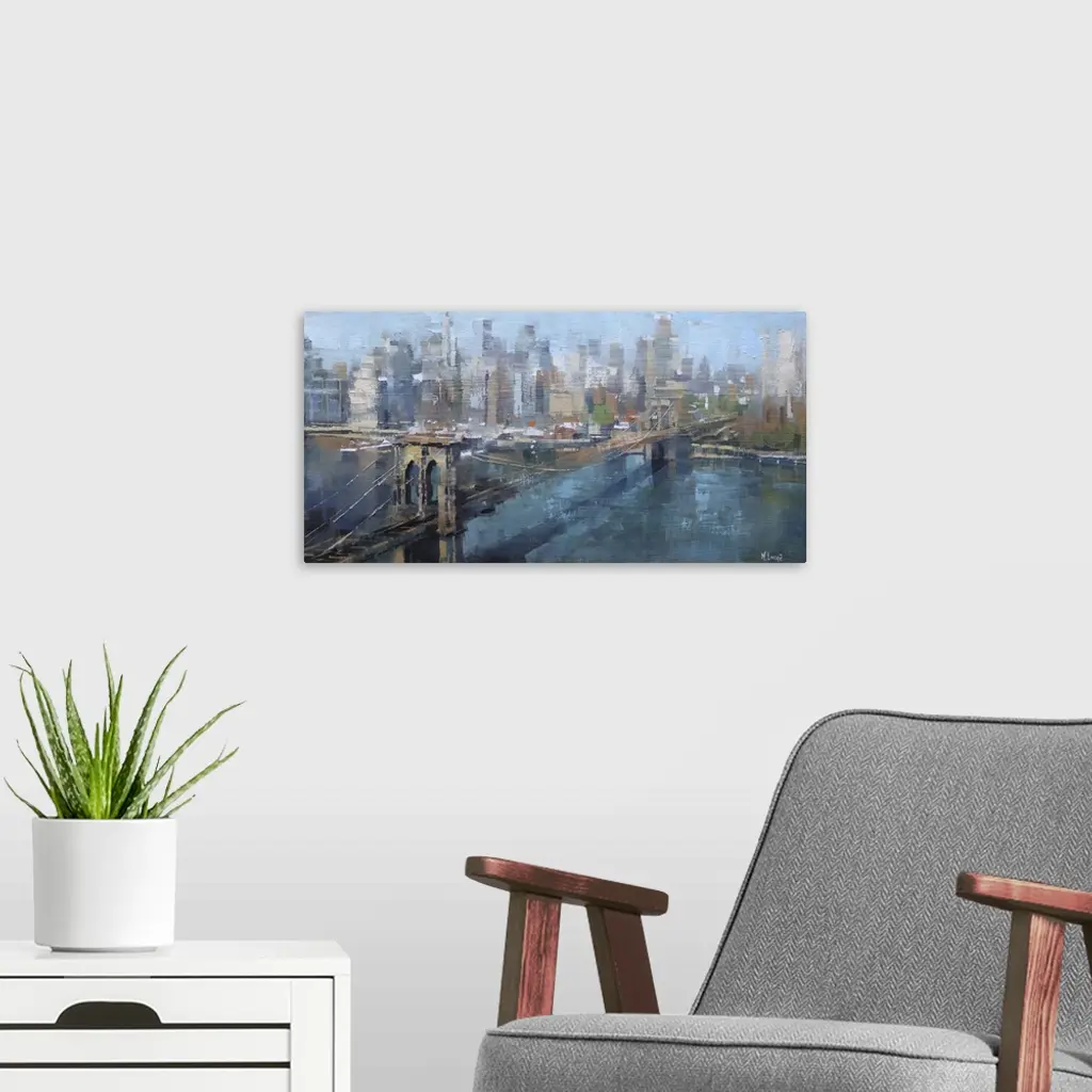 Painting of the New York City skyline with the Brooklyn Bridge in the foreground.