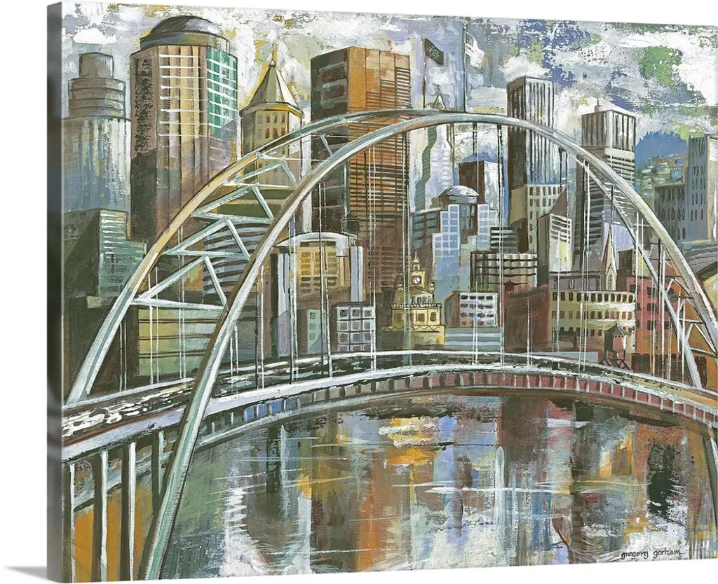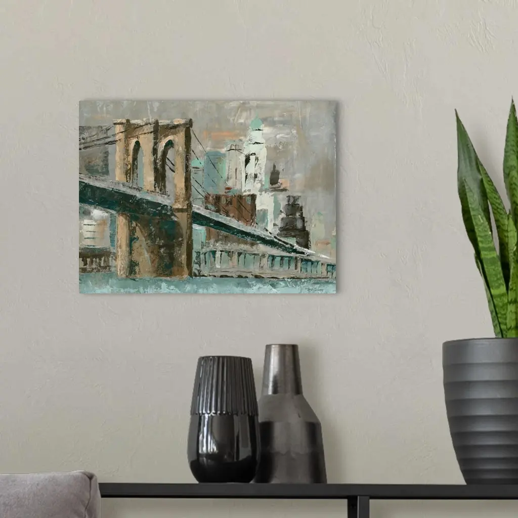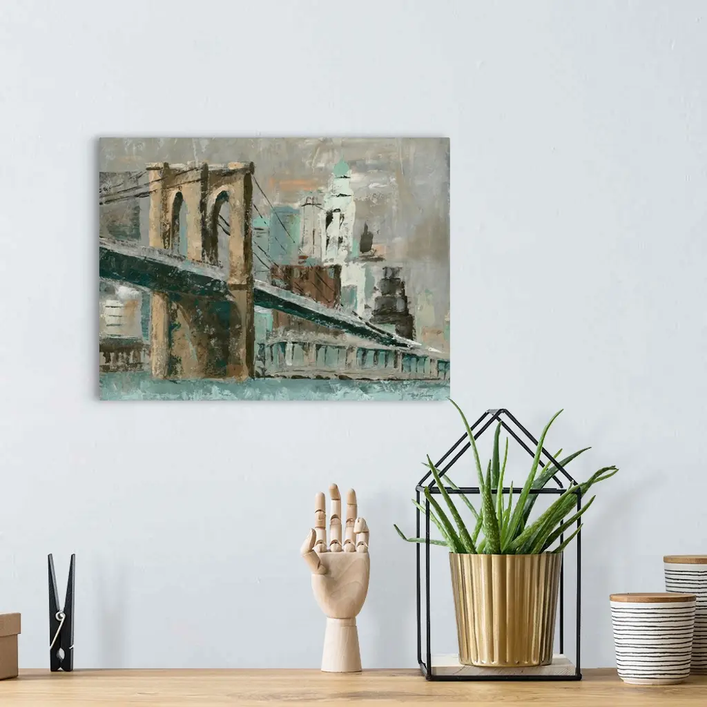 Contemporary painting of the Brooklyn Bridge in muted tones of brown and teal.