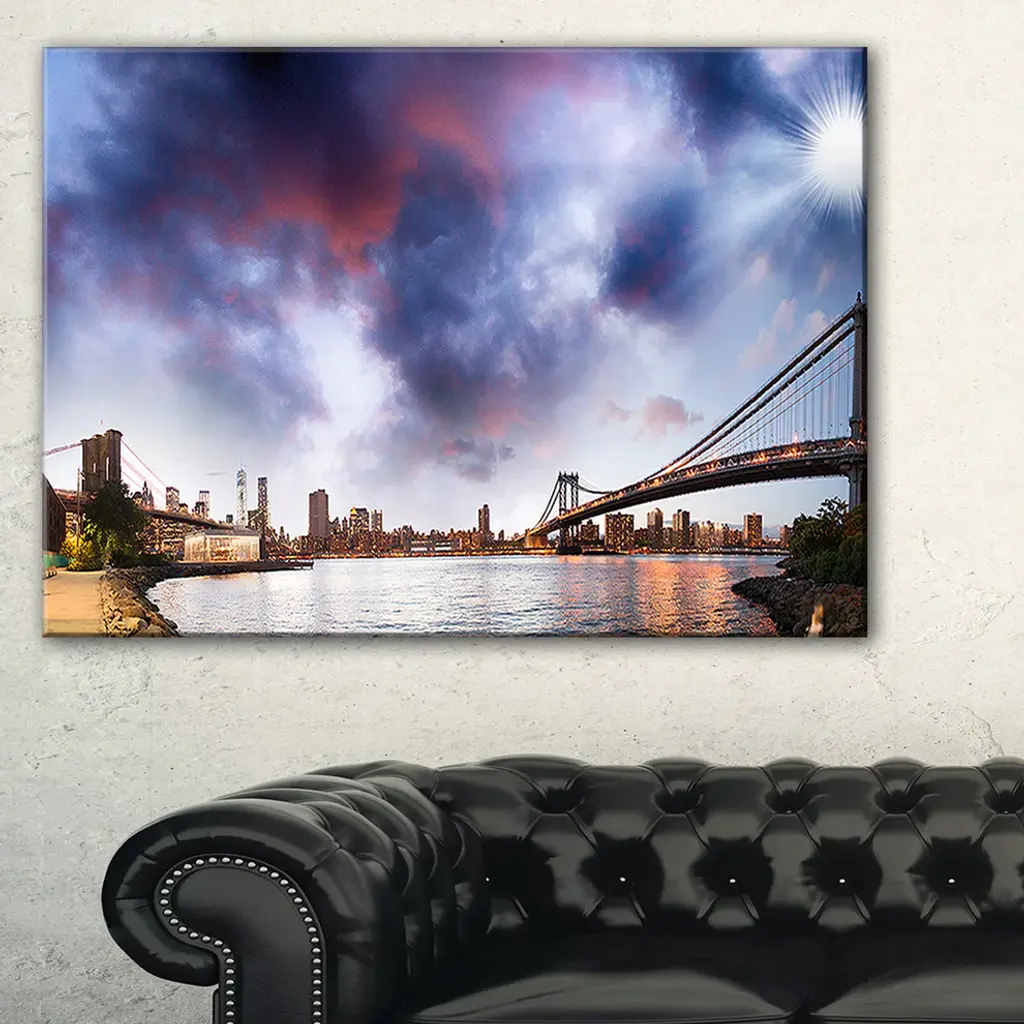 The Brooklyn Bridge over East River canvas art print is sure to make an impression on anyone who sees it. This artwork is gallery wrapped around a 1-inch solid wood frame and arrives carefully packaged and entirely ready to hang on the wall. Design Art only uses the highest resolution and pigments to ensure a crisp colorful print that is never faded or pixelated. This artwork is sure to be a conversation starter in any home or office.