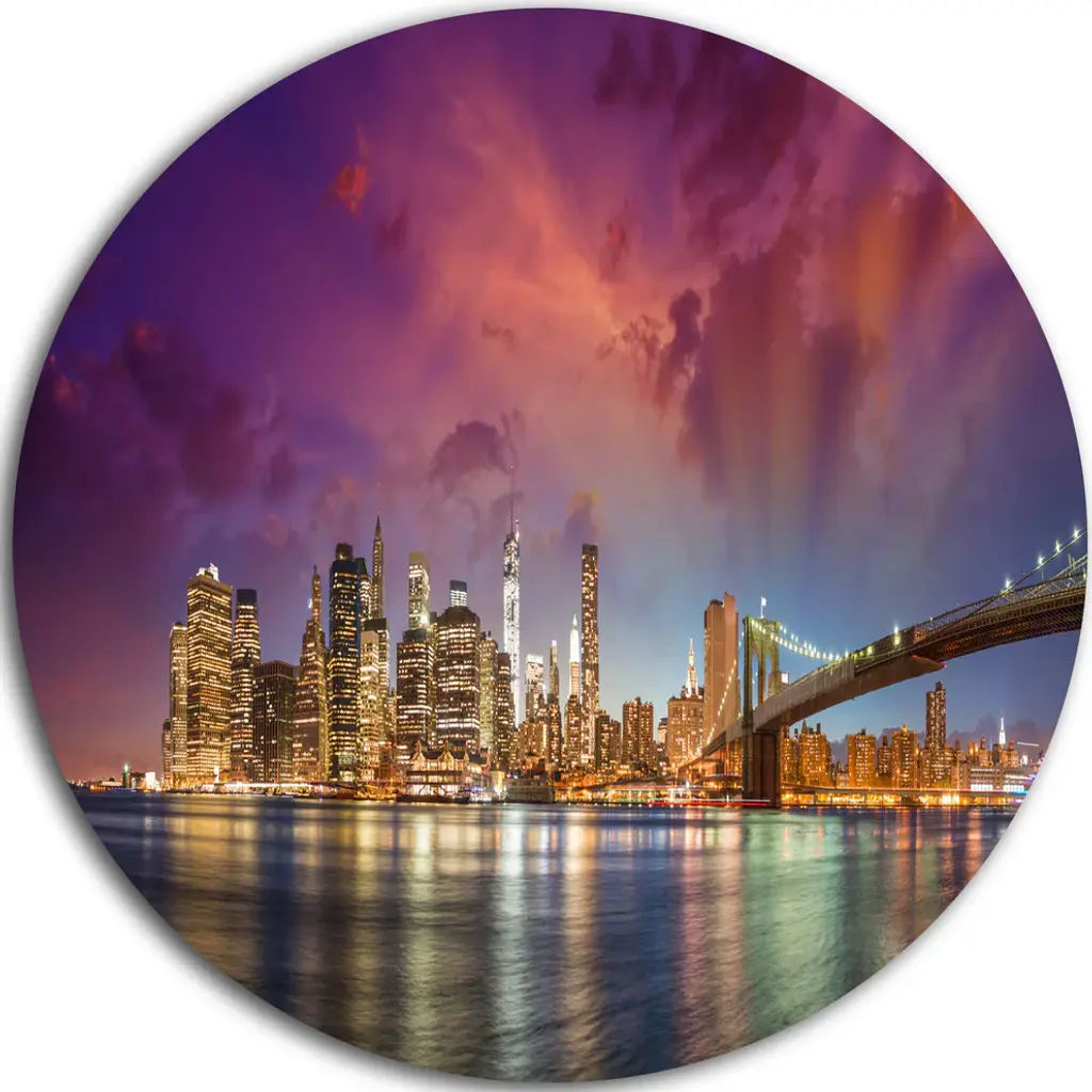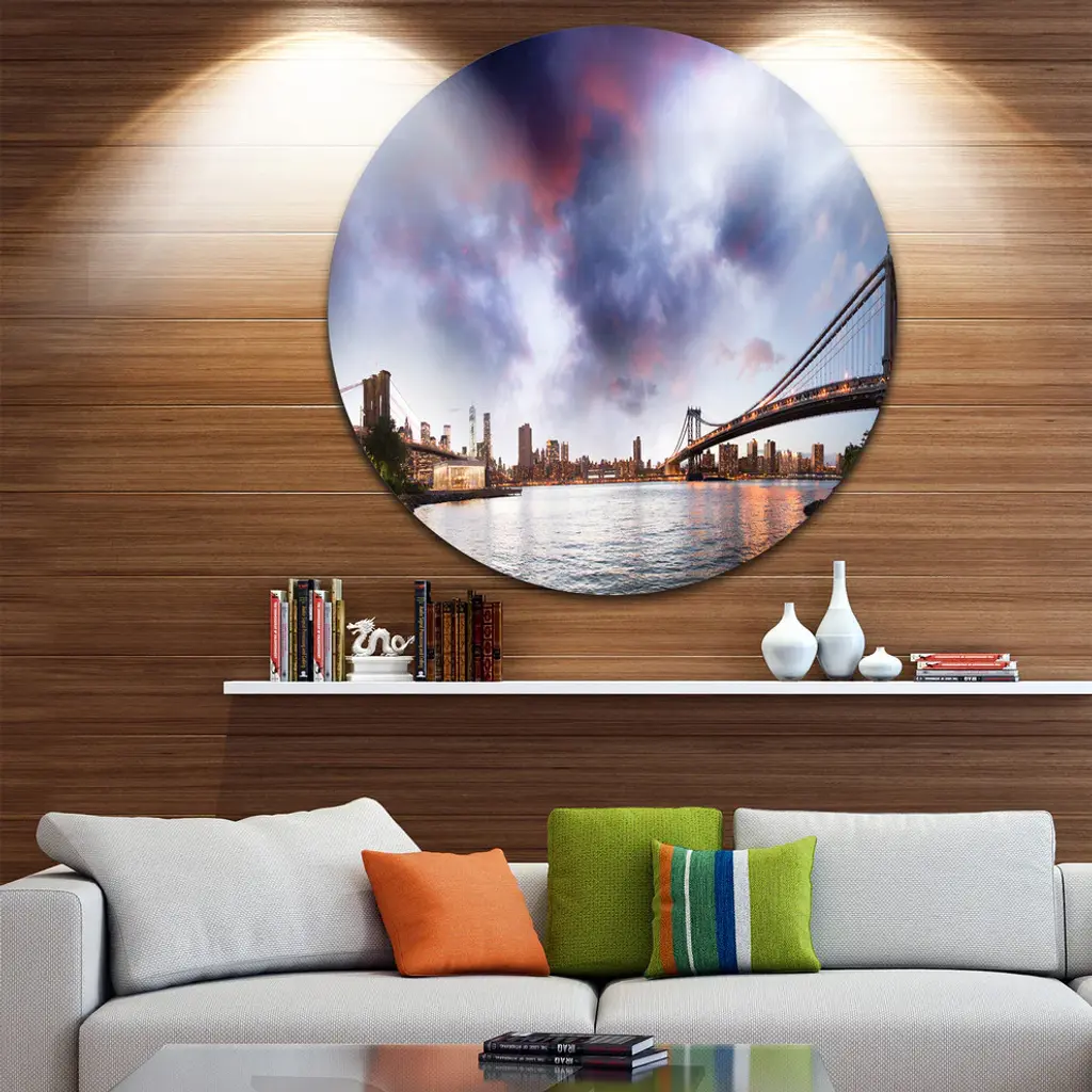 Bring Contemporary Abstraction to your home with this large Circle Metal wall art. This Brooklyn Bridge over East River Metal Artwork makes it the focal point of any room or office. - White Gloss Coating ensures colors are extra vibrant with light reflection.- Aluminum grade Sheet Metal with 1 inch mounting frame on the back giving the illusion that the artwork is floating on the wall..- Mounting Brackets are included along with instructions.- High Quality Digital images are created directly into a glossy aluminum panel producing a stunning and captivating print into the glossy finish of the metal.- Water, Fire and Scratch resistant HD Aluminum panels.- Looks better than any photo paper and guaranteed to last at least 20 years- Easy to clean with a microfiber cloth. Colors are far superior to regular Canvas Art. - Easy to Hang