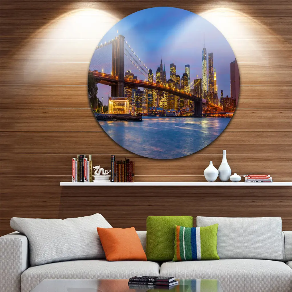 Bring Contemporary Abstraction to your home with this large Circle Metal wall art. This Brooklyn Bridge with Lights and Reflections Metal Artwork makes it the focal point of any room or office. - White Gloss Coating ensures colors are extra vibrant with light reflection.- Aluminum grade Sheet Metal with 1 inch mounting frame on the back giving the illusion that the artwork is floating on the wall..- Mounting Brackets are included along with instructions.- High Quality Digital images are created directly into a glossy aluminum panel producing a stunning and captivating print into the glossy finish of the metal.- Water, Fire and Scratch resistant HD Aluminum panels.- Looks better than any photo paper and guaranteed to last at least 20 years- Easy to clean with a microfiber cloth. Colors are far superior to regular Canvas Art. - Easy to Hang