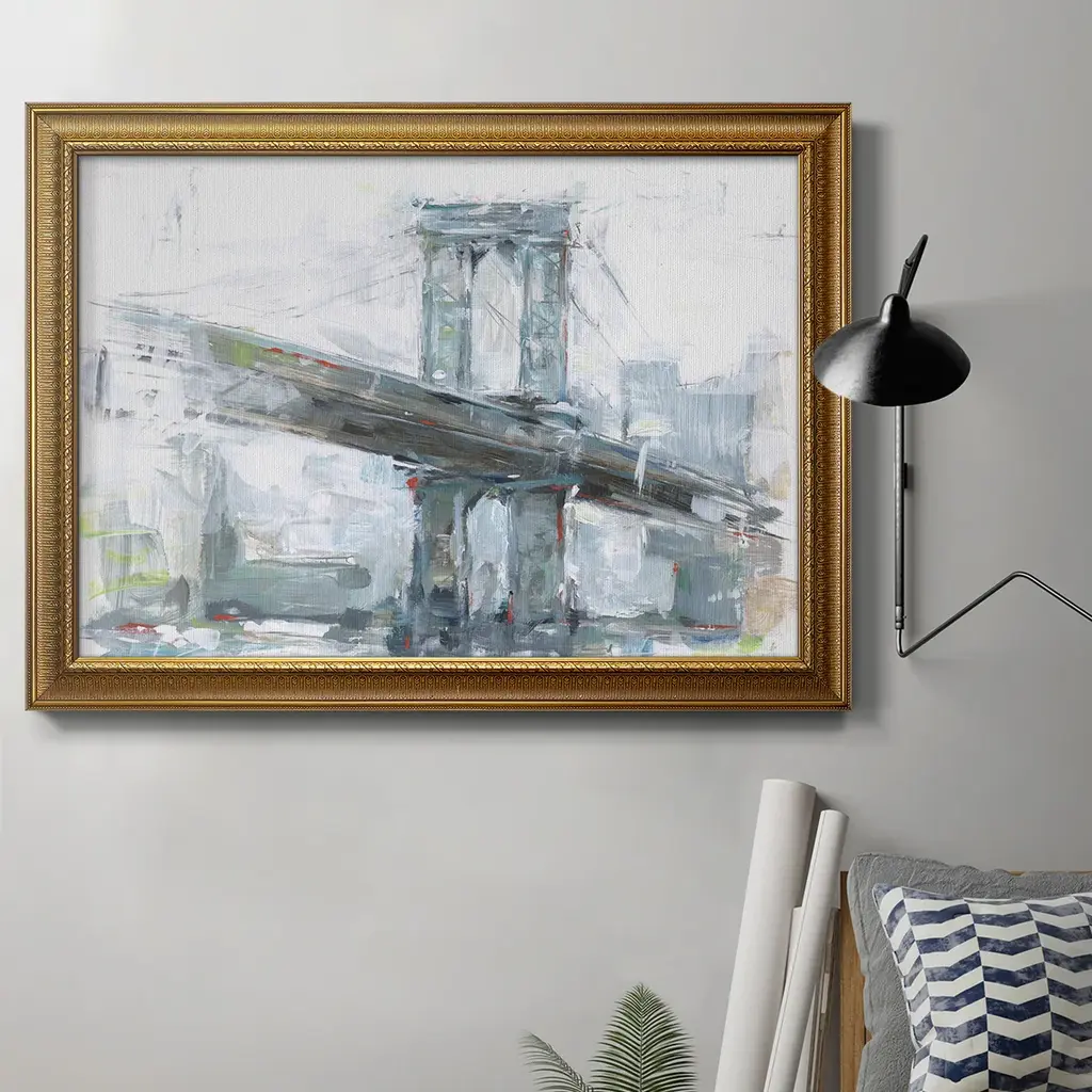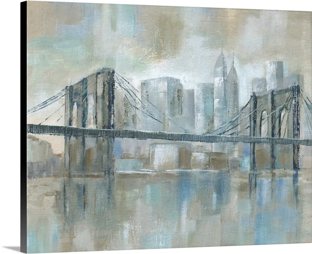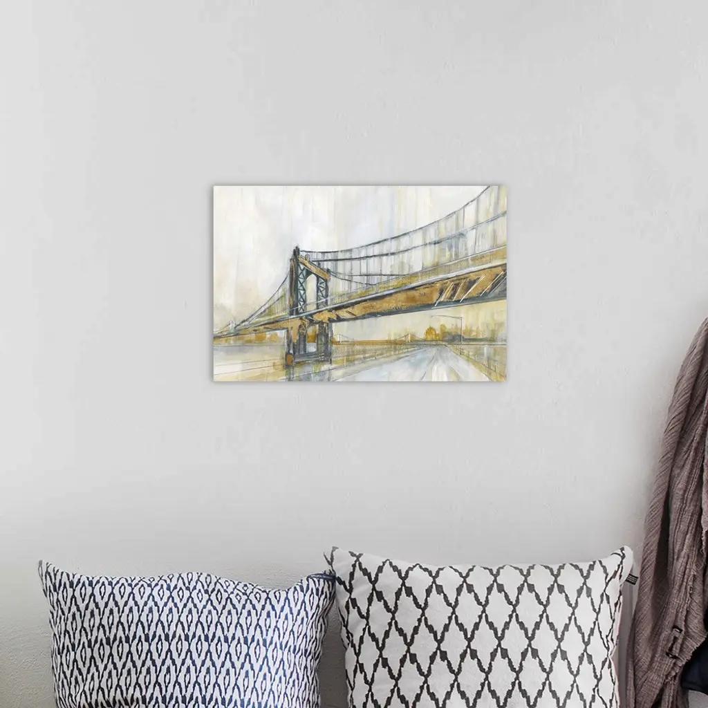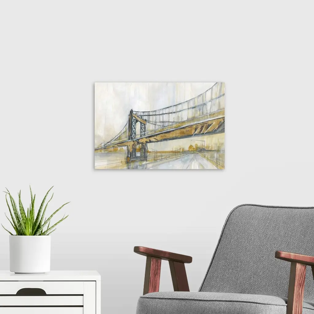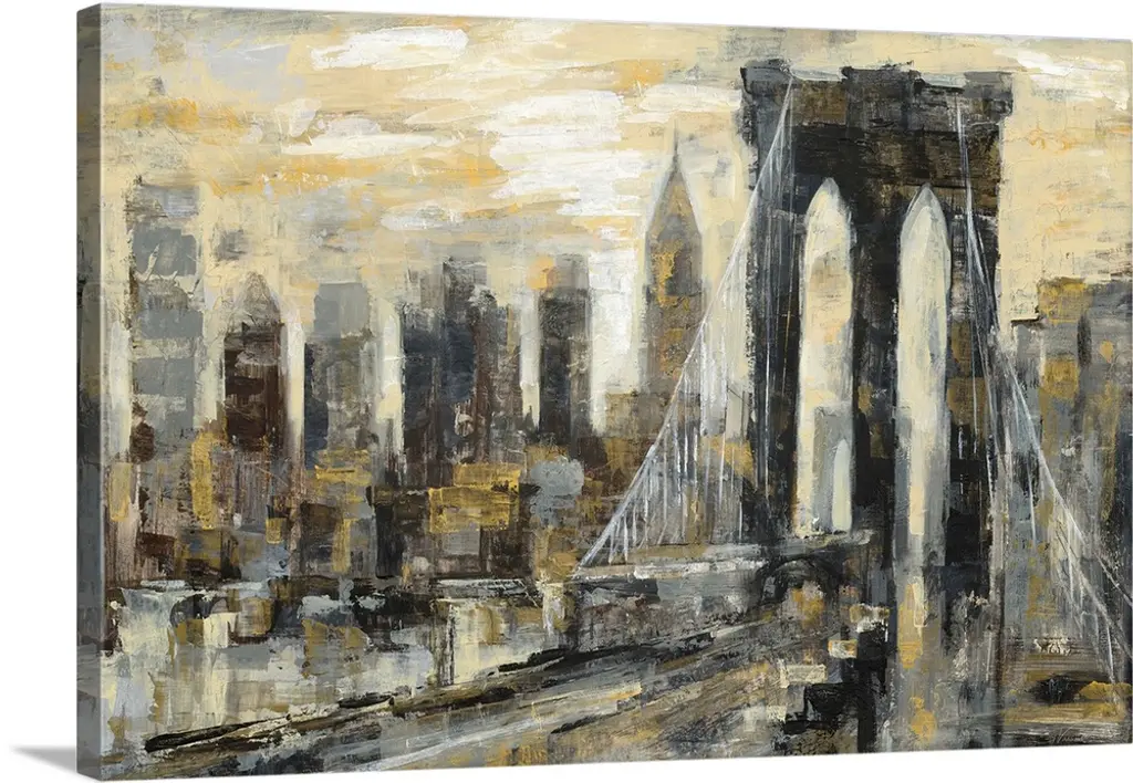 Contemporary painting of the Manhattan Bridge in New York City in shades of gold and grey.