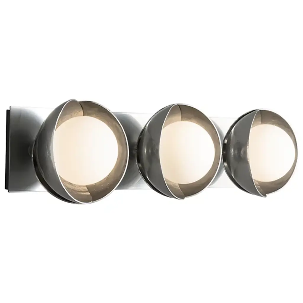 The Brooklyn Straight Double Shade Vanity Light by Hubbardton Forge plays on the idea of movement and flow. Our artisans took curvature to the next level, making a single lid-like shade the focal point of this cluster semi-flushmount light. A unique, forged-steel shade sits at the end of each rod, extending up to a slim circular base and extending down to a globe. The shade on each globe can be adjusted to direct the light as needed. Mount this semi-flushmount fixture in your bedroom, hallway, or foyer.
