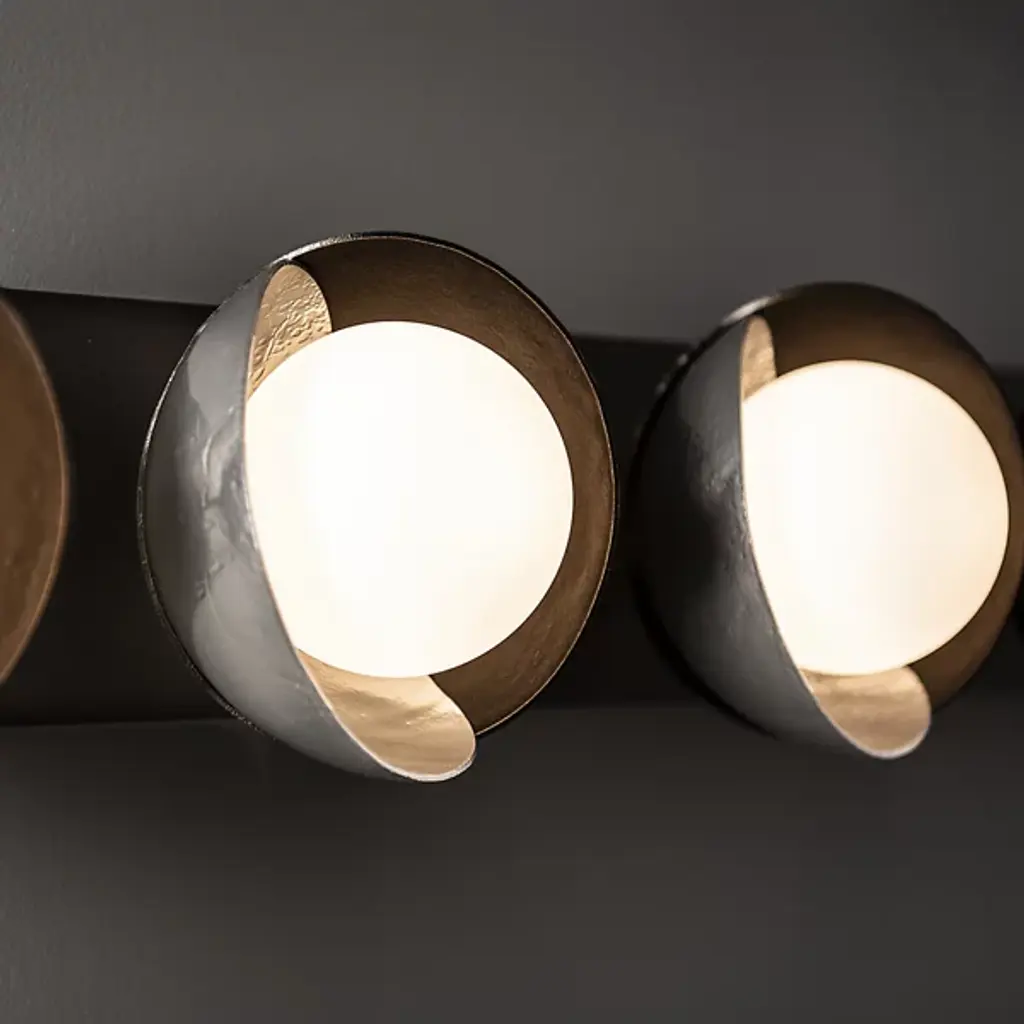 The Brooklyn Straight Double Shade Vanity Light by Hubbardton Forge plays on the idea of movement and flow. Our artisans took curvature to the next level, making a single lid-like shade the focal point of this cluster semi-flushmount light. A unique, forged-steel shade sits at the end of each rod, extending up to a slim circular base and extending down to a globe. The shade on each globe can be adjusted to direct the light as needed. Mount this semi-flushmount fixture in your bedroom, hallway, or foyer.