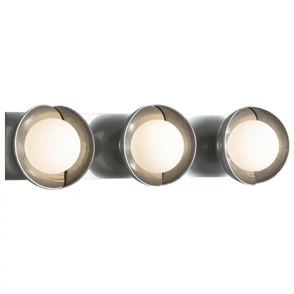 The Brooklyn Straight Double Shade Vanity Light by Hubbardton Forge plays on the idea of movement and flow. Our artisans took curvature to the next level, making a single lid-like shade the focal point of this cluster semi-flushmount light. A unique, forged-steel shade sits at the end of each rod, extending up to a slim circular base and extending down to a globe. The shade on each globe can be adjusted to direct the light as needed. Mount this semi-flushmount fixture in your bedroom, hallway, or foyer.