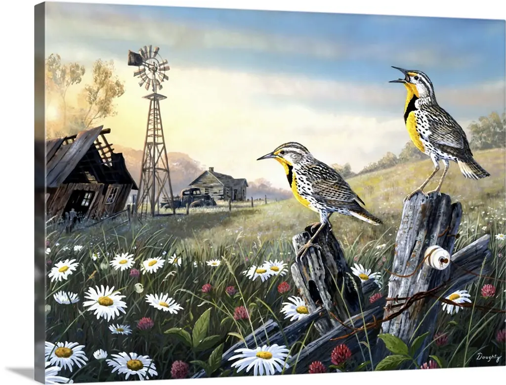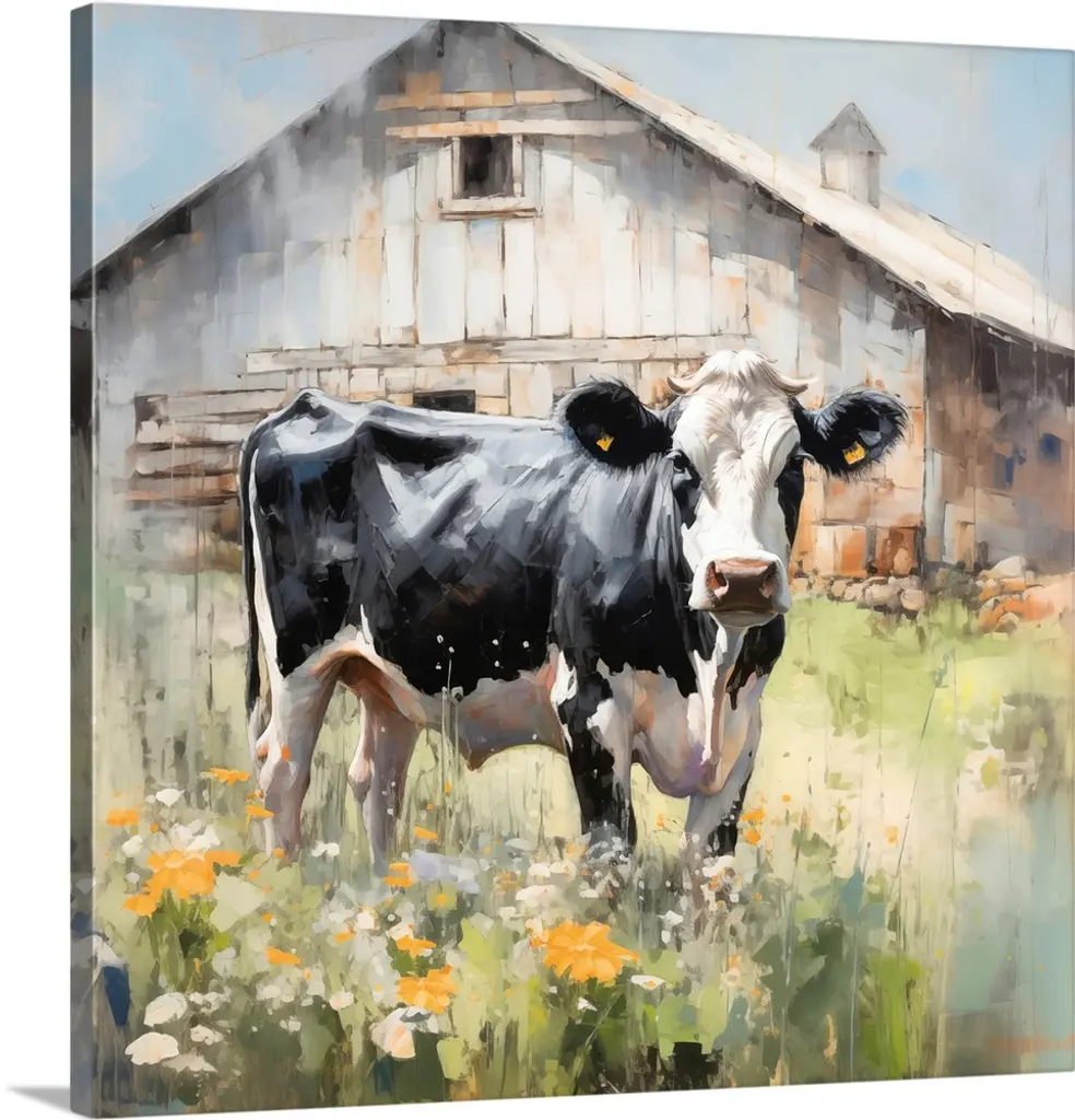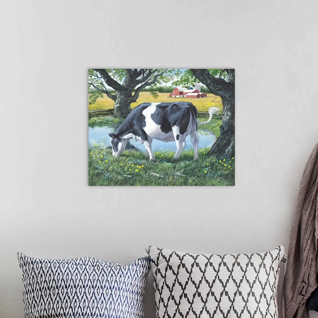 Contemporary artwork of a cow grazing on lush grass next to a pond, with a red barn in the distance.