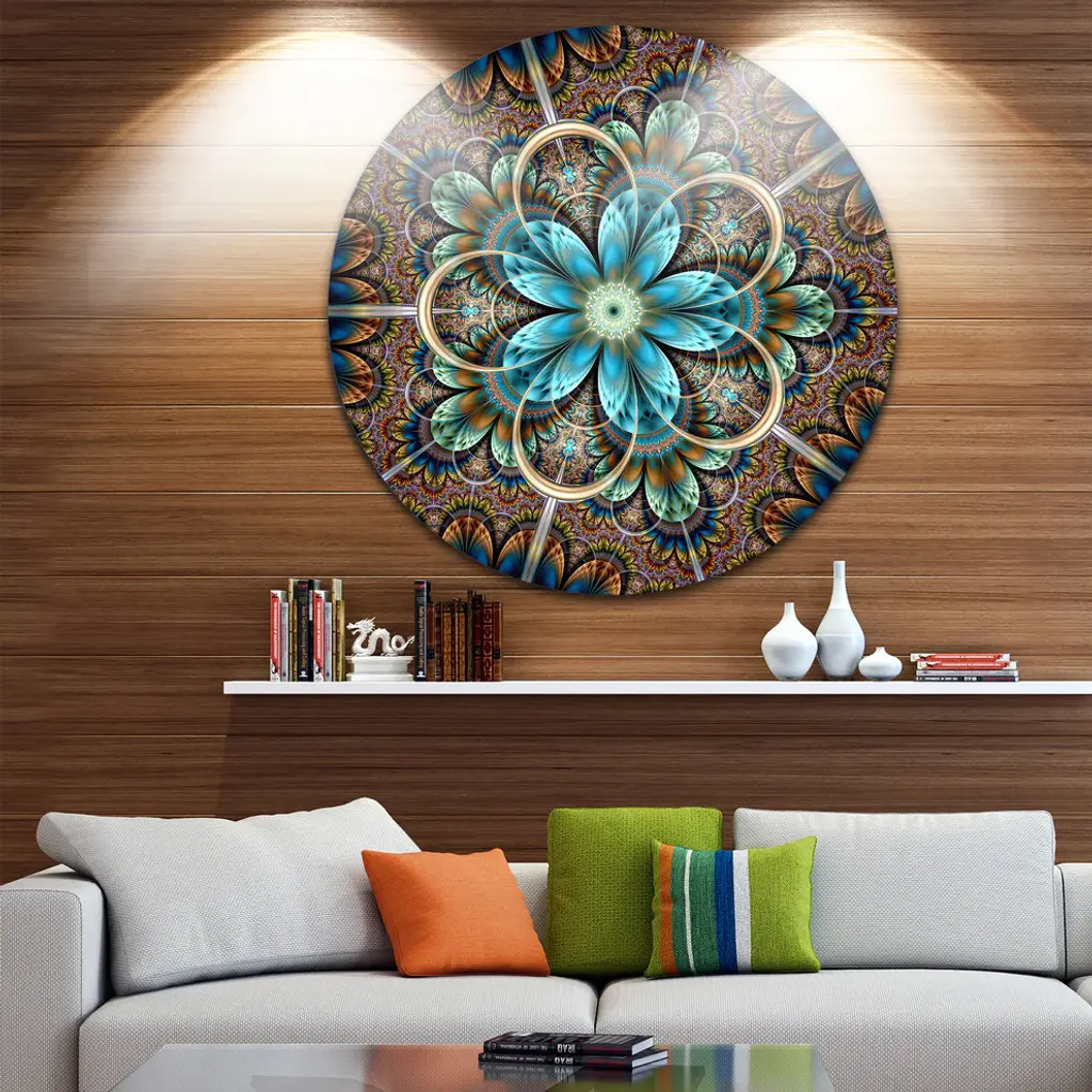 Bring Contemporary Abstraction to your home with this large Circle Metal wall art. This Large Brown Blue Fractal Flower Metal Artwork makes it the focal point of any room or office. - White Gloss Coating ensures colors are extra vibrant with light reflection.- Aluminum grade Sheet Metal with 1 inch mounting frame on the back giving the illusion that the artwork is floating on the wall..- Mounting Brackets are included along with instructions.- High Quality Digital images are created directly into a glossy aluminum panel producing a stunning and captivating print into the glossy finish of the metal.- Water, Fire and Scratch resistant HD Aluminum panels.- Looks better than any photo paper and guaranteed to last at least 20 years- Easy to clean with a microfiber cloth. Colors are far superior to regular Canvas Art. - Easy to Hang