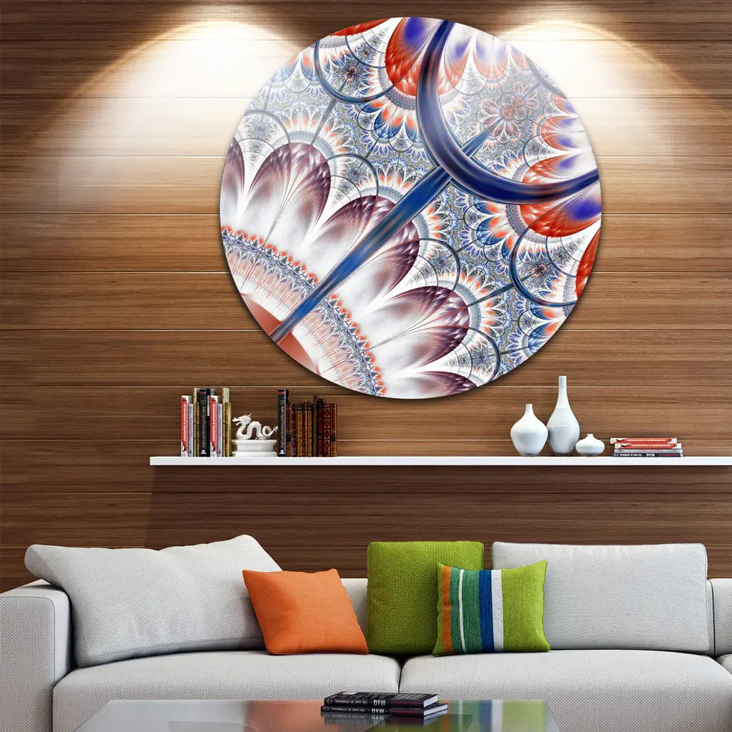 Bring Contemporary Abstraction to your home with this large Circle Metal wall art. This Brown Blue Fractal Flower Pattern Metal Artwork makes it the focal point of any room or office. - White Gloss Coating ensures colors are extra vibrant with light reflection.- Aluminum grade Sheet Metal with 1 inch mounting frame on the back giving the illusion that the artwork is floating on the wall..- Mounting Brackets are included along with instructions.- High Quality Digital images are created directly into a glossy aluminum panel producing a stunning and captivating print into the glossy finish of the metal.- Water, Fire and Scratch resistant HD Aluminum panels.- Looks better than any photo paper and guaranteed to last at least 20 years- Easy to clean with a microfiber cloth. Colors are far superior to regular Canvas Art. - Easy to Hang