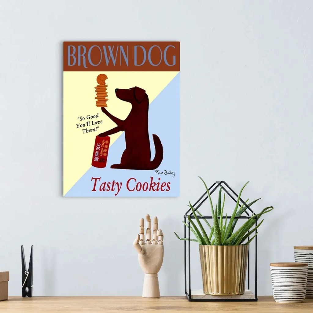 Portrait artwork on a large wall hanging of an advertisement for Brown Dog Tasty Cookies. A brown dog sits upright while holding a stack of cookies with one paw and the other paw placed on top of the container. Text on the image reads ""So Good You'll Love Them"".