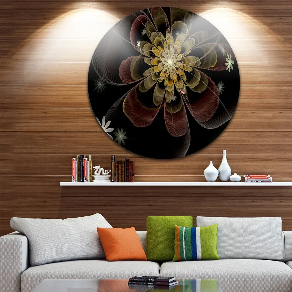 Bring Contemporary Abstraction to your home with this large Circle Metal wall art. This Brown Fractal Flower with Silver stars Metal Artwork makes it the focal point of any room or office. - White Gloss Coating ensures colors are extra vibrant with light reflection.- Aluminum grade Sheet Metal with 1 inch mounting frame on the back giving the illusion that the artwork is floating on the wall..- Mounting Brackets are included along with instructions.- High Quality Digital images are created directly into a glossy aluminum panel producing a stunning and captivating print into the glossy finish of the metal.- Water, Fire and Scratch resistant HD Aluminum panels.- Looks better than any photo paper and guaranteed to last at least 20 years- Easy to clean with a microfiber cloth. Colors are far superior to regular Canvas Art. - Easy to Hang