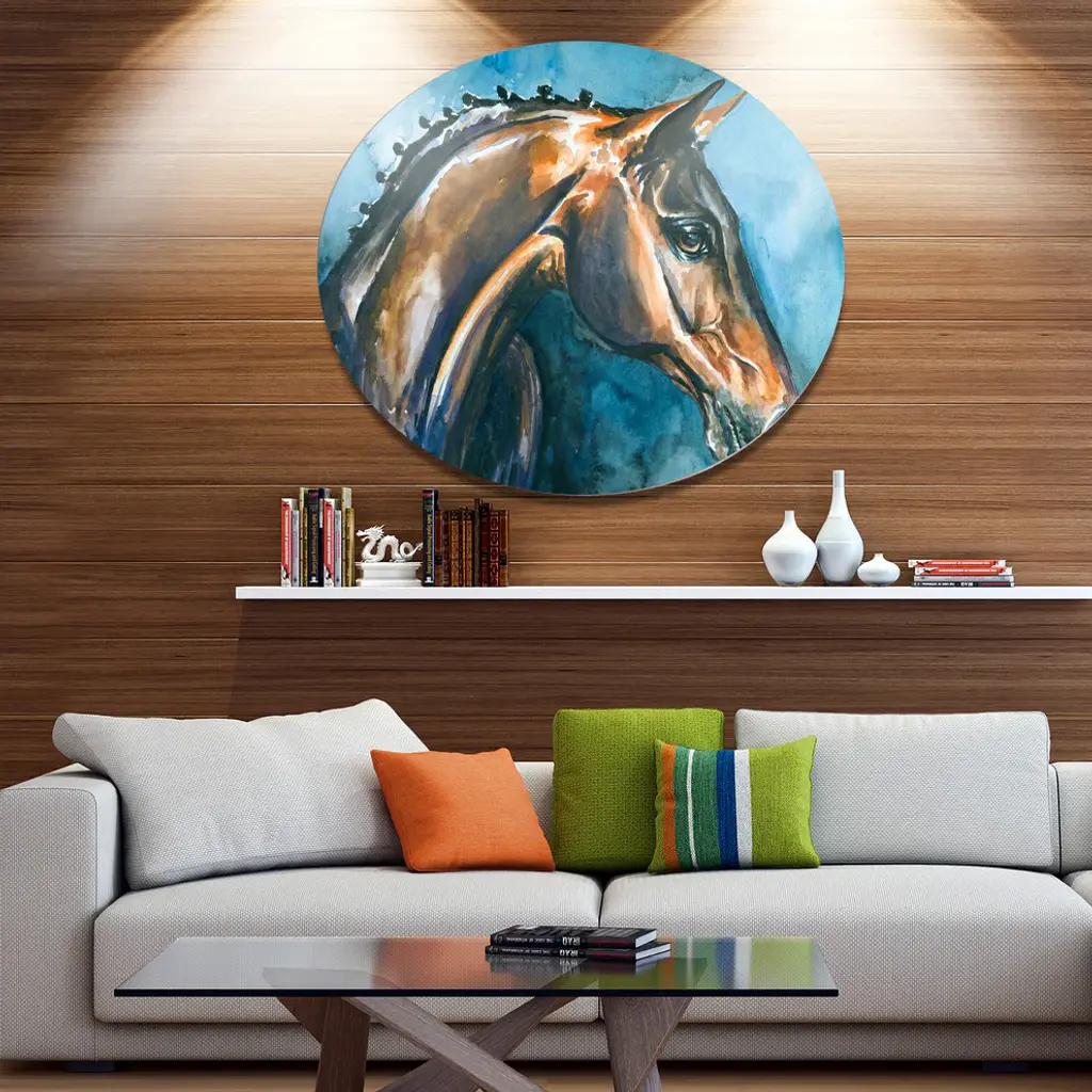 Bring Contemporary Abstraction to your home with this large Circle Metal wall art. This Brown Horse on Blue Watercolor Metal Artwork makes it the focal point of any room or office. - White Gloss Coating ensures colors are extra vibrant with light reflection.- Aluminum grade Sheet Metal with 1 inch mounting frame on the back giving the illusion that the artwork is floating on the wall..- Mounting Brackets are included along with instructions.- High Quality Digital images are created directly into a glossy aluminum panel producing a stunning and captivating print into the glossy finish of the metal.- Water, Fire and Scratch resistant HD Aluminum panels.- Looks better than any photo paper and guaranteed to last at least 20 years- Easy to clean with a microfiber cloth. Colors are far superior to regular Canvas Art. - Easy to Hang