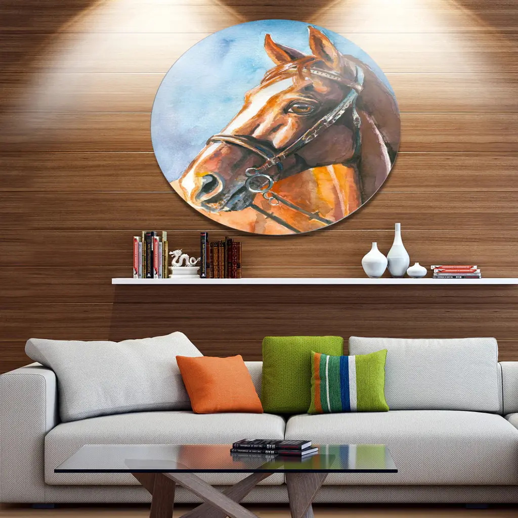 Bring Contemporary Abstraction to your home with this large Circle Metal wall art. This Brown Horse with Bridle Metal Artwork makes it the focal point of any room or office. - White Gloss Coating ensures colors are extra vibrant with light reflection.- Aluminum grade Sheet Metal with 1 inch mounting frame on the back giving the illusion that the artwork is floating on the wall..- Mounting Brackets are included along with instructions.- High Quality Digital images are created directly into a glossy aluminum panel producing a stunning and captivating print into the glossy finish of the metal.- Water, Fire and Scratch resistant HD Aluminum panels.- Looks better than any photo paper and guaranteed to last at least 20 years- Easy to clean with a microfiber cloth. Colors are far superior to regular Canvas Art. - Easy to Hang