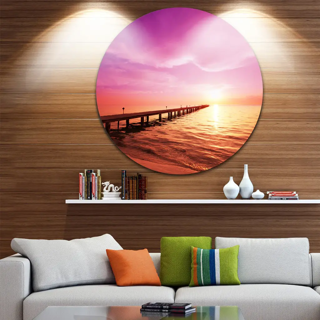 Brown Sea And Pier Under Magenta Sky, Sea Bridge Round Wall Art, 36"