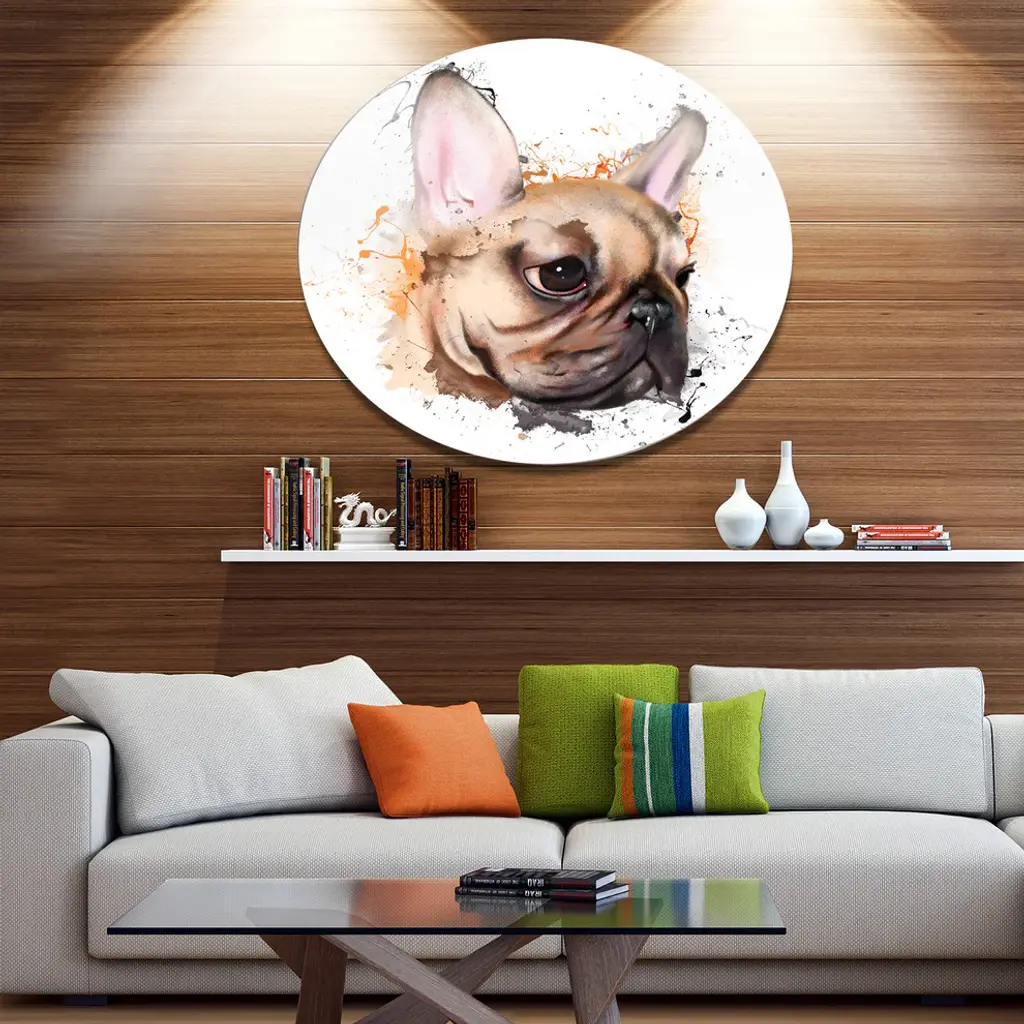 Bring Contemporary Abstraction to your home with this large Circle Metal wall art. This Brown Watercolor French Bulldog Metal Artwork makes it the focal point of any room or office. - White Gloss Coating ensures colors are extra vibrant with light reflection.- Aluminum grade Sheet Metal with 1 inch mounting frame on the back giving the illusion that the artwork is floating on the wall..- Mounting Brackets are included along with instructions.- High Quality Digital images are created directly into a glossy aluminum panel producing a stunning and captivating print into the glossy finish of the metal.- Water, Fire and Scratch resistant HD Aluminum panels.- Looks better than any photo paper and guaranteed to last at least 20 years- Easy to clean with a microfiber cloth. Colors are far superior to regular Canvas Art. - Easy to Hang