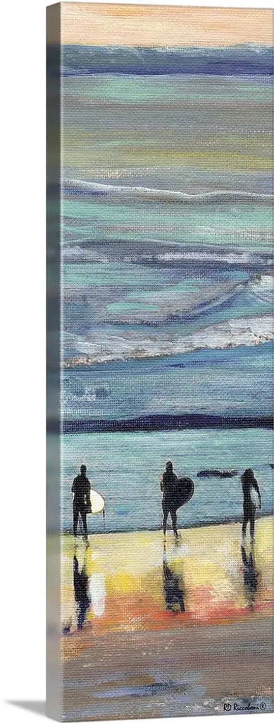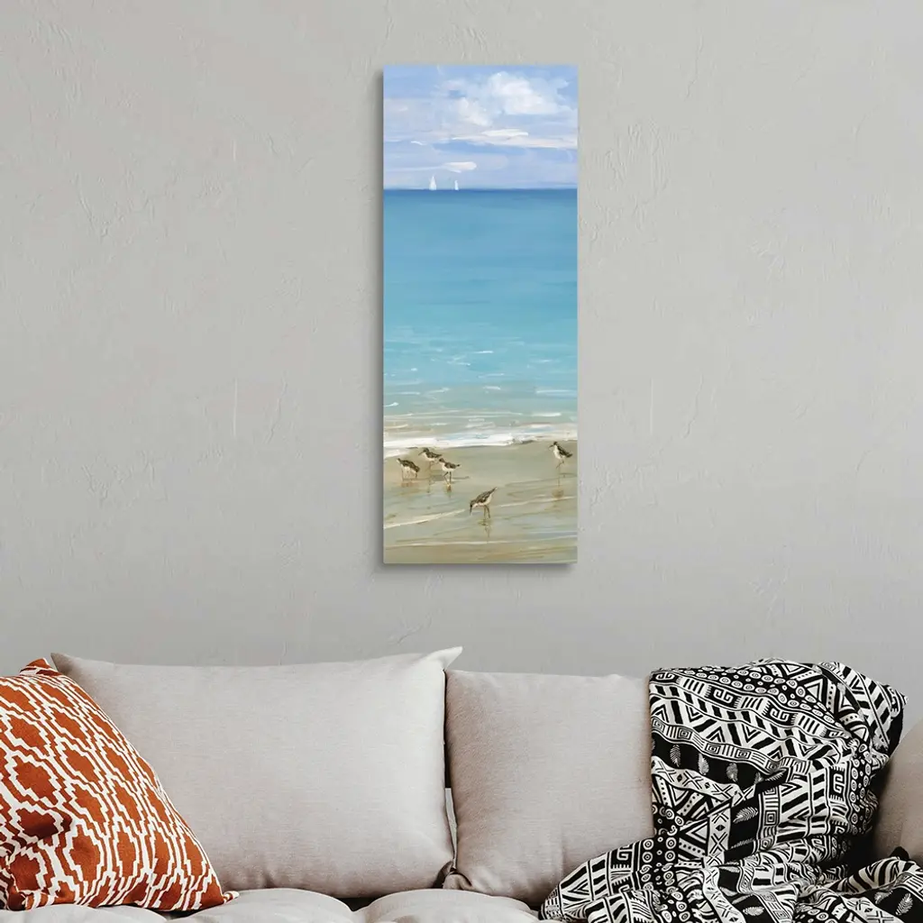 Tall contemporary painting of seabirds on the shore with blue water and sailboats in the background.