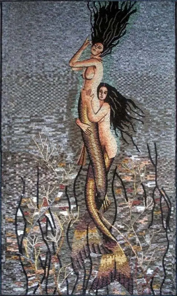 Introducing the stunning "Brunette Mermaids Mosaic," a captivating piece of art that brings the enchanting world of mermaids right into your home. This hand-made stone mosaic features two beautiful mermaids gamboling gracefully in the waves, showcasing the elegance and mystery of these mythical creatures. Crafted with meticulous attention to detail, the Brunette Mermaids Mosaic is made from 100% natural marble and decorative tiles, ensuring a high-quality, durable piece that will stand the test of time. Whether you're looking to add a touch of whimsy to your living space or searching for the perfect gift for a mermaid enthusiast, this exquisite mosaic is sure to impress. The interplay of colors and textures in the stonework creates a mesmerizing visual experience, making it a standout centerpiece for any room. Each piece is uniquely crafted, so you can be assured that your Brunette Mermaids Mosaic is one of a kind. Transform your decor with this artistic representation of the ocean's beauty and the allure of mermaids. Ideal as a mosaic mural, a coastal-themed room, a child’s nursery, or even a sophisticated adult space, this mosaic brings a sense of tranquility and wonder wherever it is displayed. The Brunette Mermaids Mosaic not only serves as an eye-catching artwork but also as a conversation starter among guests. Embrace the magic with the Brunette Mermaids Mosaic, and let the spirit of the sea inspire your home decor today!