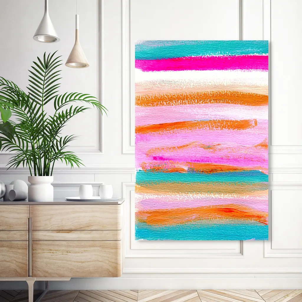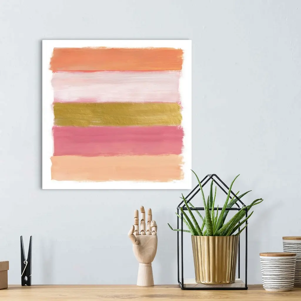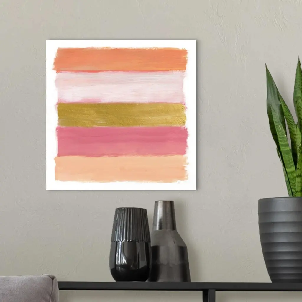 Five horizontal brush strokes stacked on top of each other construct this horizontal abstract contemporary painting.