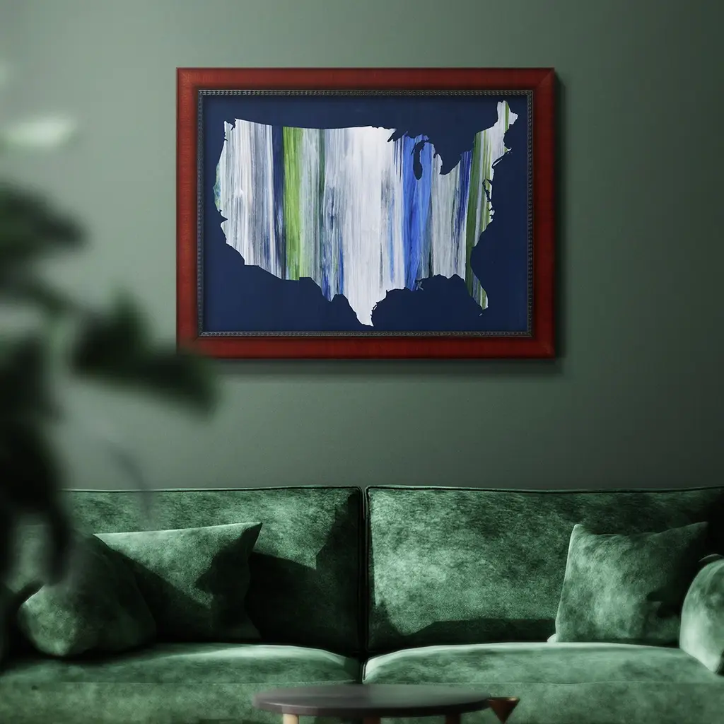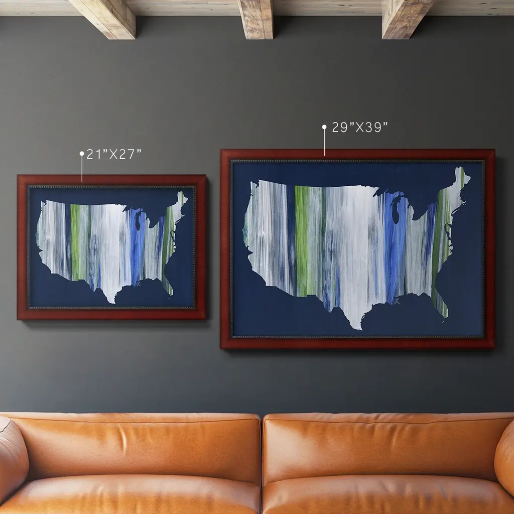 Brushstroke USA Premium Framed Canvas- Ready to Hang A Premium Framed Canvas created to last. Framed in distressed wood and available in an array of sizes and colors Featuring a beveled a solid wood stretcher bar, each piece comes ready to hand 3 SIZES AVAILABLE 16''X20'' - Overall Size 18'X27'' - Overall Size 24''x36'' - Overall Size Each piece is made to order. Each piece comes with hanging hardware. Made in the USA Ready to Hang Giclee Paper Print Acrylic Glass Beveled Matt Board