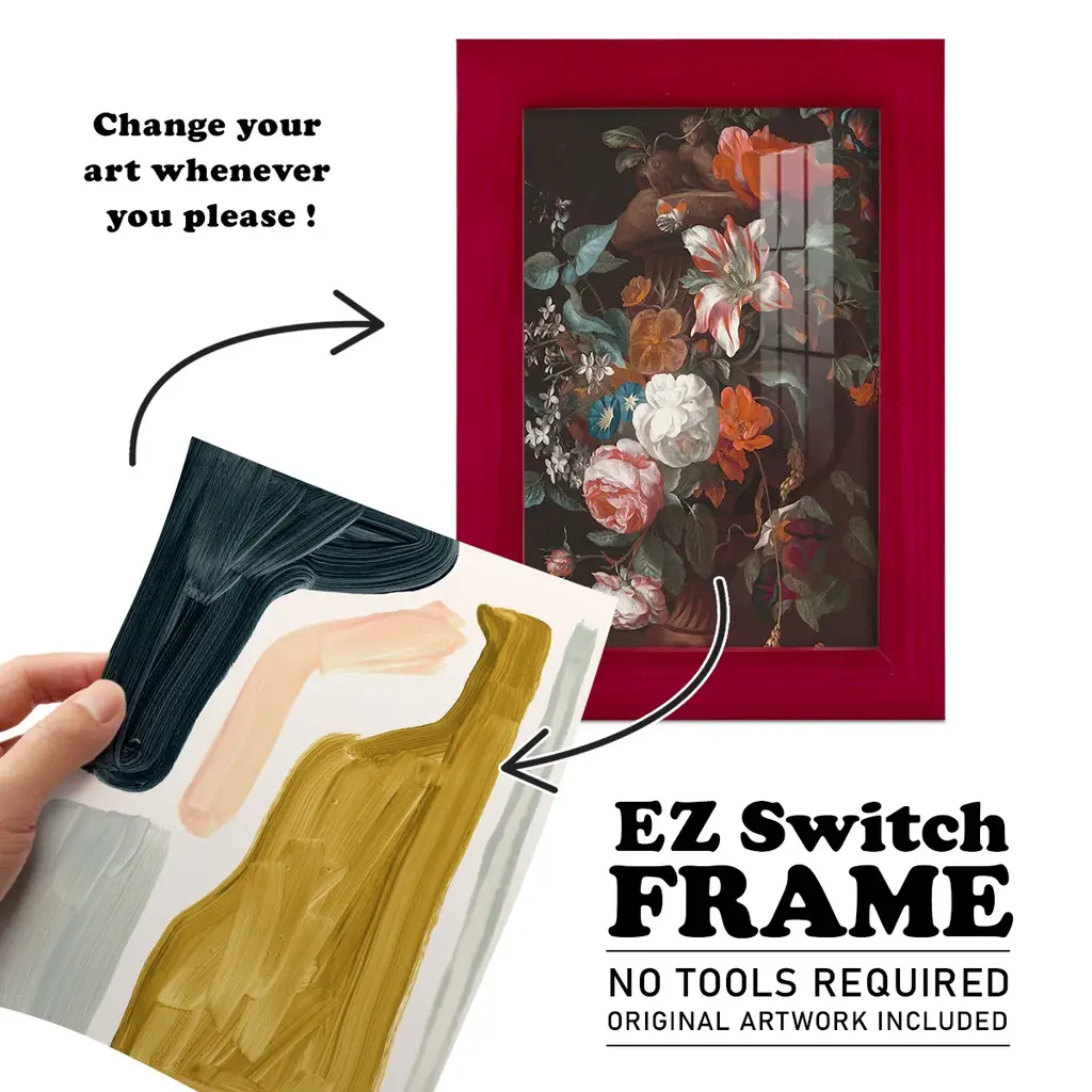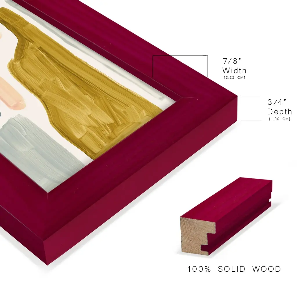 Brushy Shapes I -EZ SWITCH Framed Print w/glass-Cherry Red A delightful, framed print. Featuring a solid wood frame with real wood glass. This premium print is giclee quality. In addition, every frame features a removable back and table top stand. This allows you to change your art in the future or to just stand the art on a table for a new look. We are sure you'll enjoy our new series of EZ SWITCH Framed Art. Solid Wood Frame Real Glass Removable / Replaceable Art Built in Tabletop Stand Sizes range from 4x6 up to 12x15 - buy just one or pair them up as sets as you see fit.