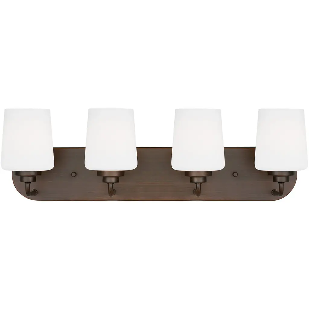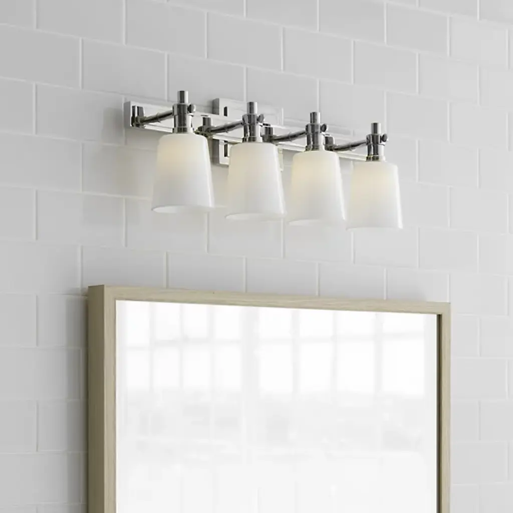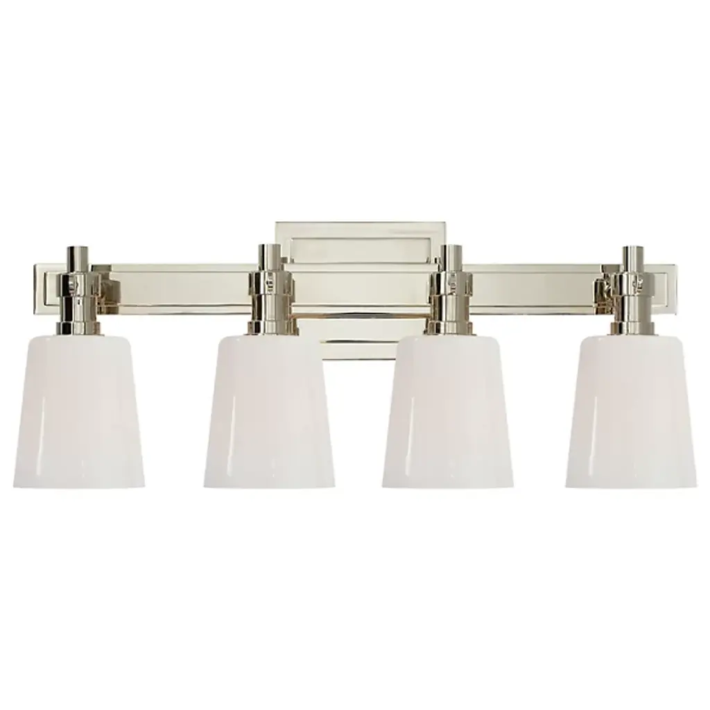 Simple task lighting that transcends modern décor. The Bryant Vanity Light by Visual Comfort Signature, formerly known as Visual Comfort, offers the minimalist good looks of a concentric square wall plate and rectangular frame, combined with four individual tapered white shades. Light shines at a downward trajectory, allowing for ample task lighting in the bathroom. Combine with an optional dimmer switch for full customization.