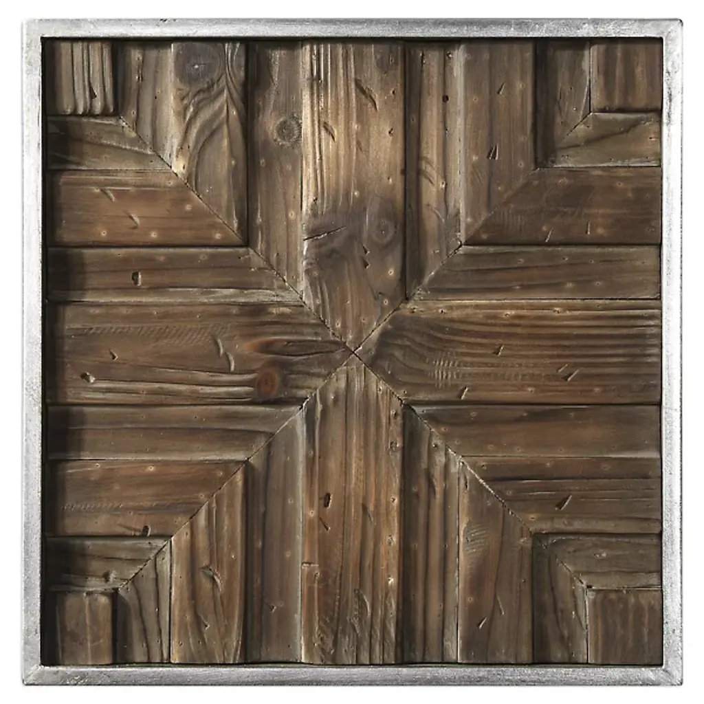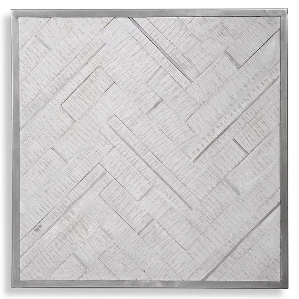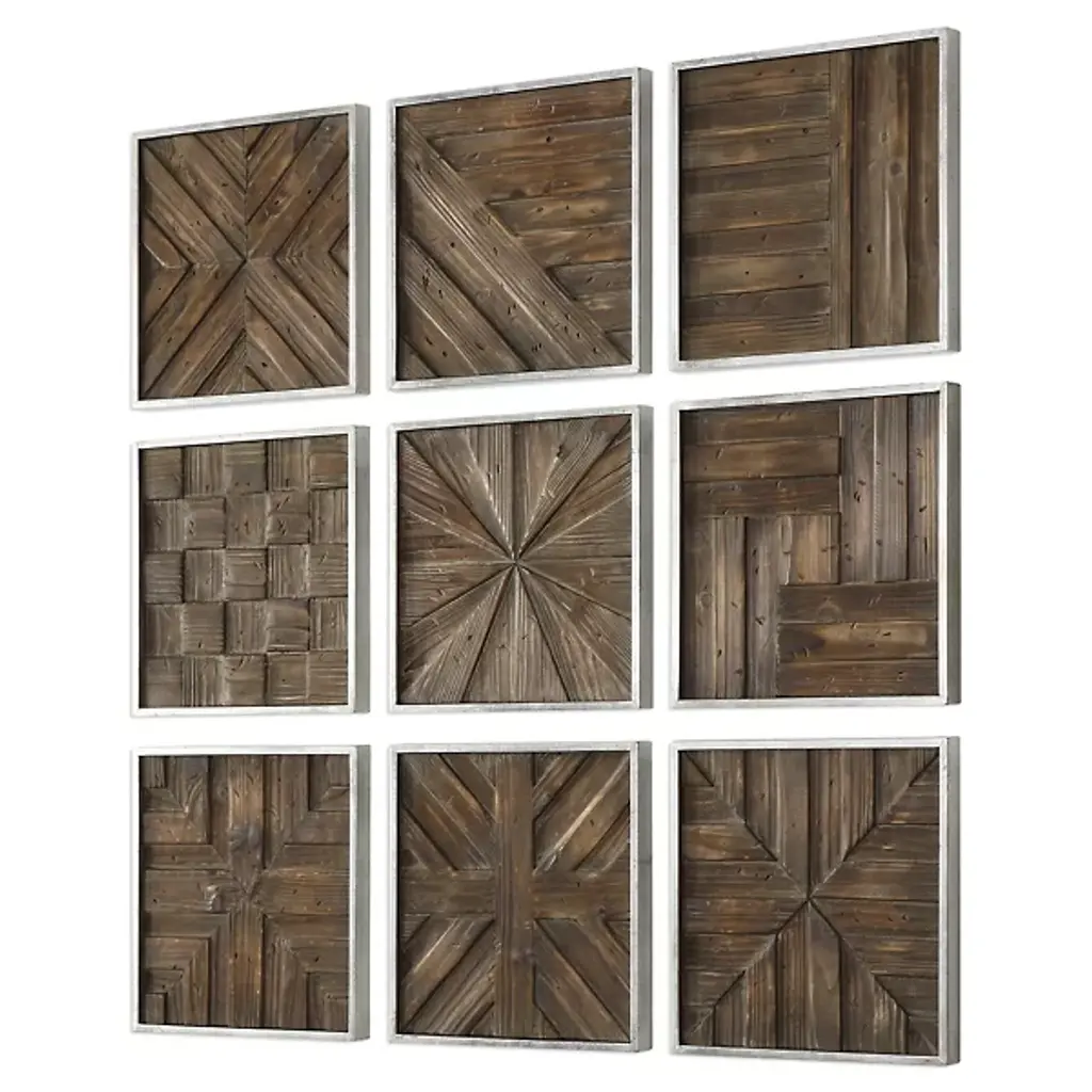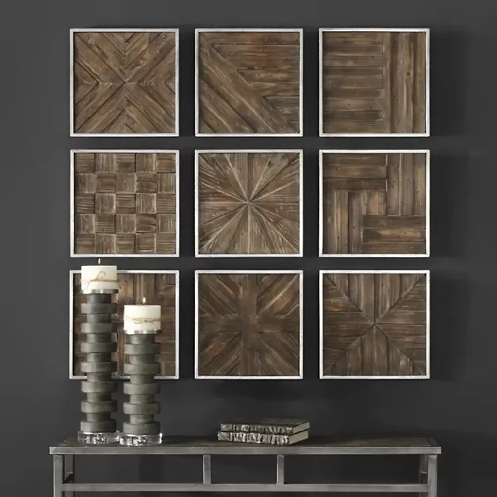 The Bryndle Wooden Wall Art, Set of 9 from Uttermost renovates wall space into a gallery of pattern and texture using reclaimed fir wood. Each panel displays a distinct geometric arrangement-from starburst patterns and chevrons to basket weaves and linear compositions. The weathered wood surfaces retain their original character marks, knots, and nail holes that give each piece authenticity. The silver leaf frames provide a clean boundary that unifies the collection while creating subtle separation between the varying designs. This modular installation offers countless arrangement possibilities, allowing you to create custom configurations tailored to your specific wall dimensions.