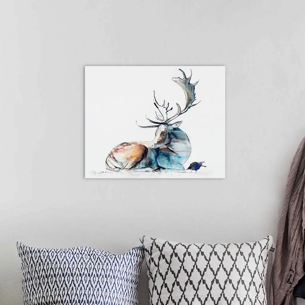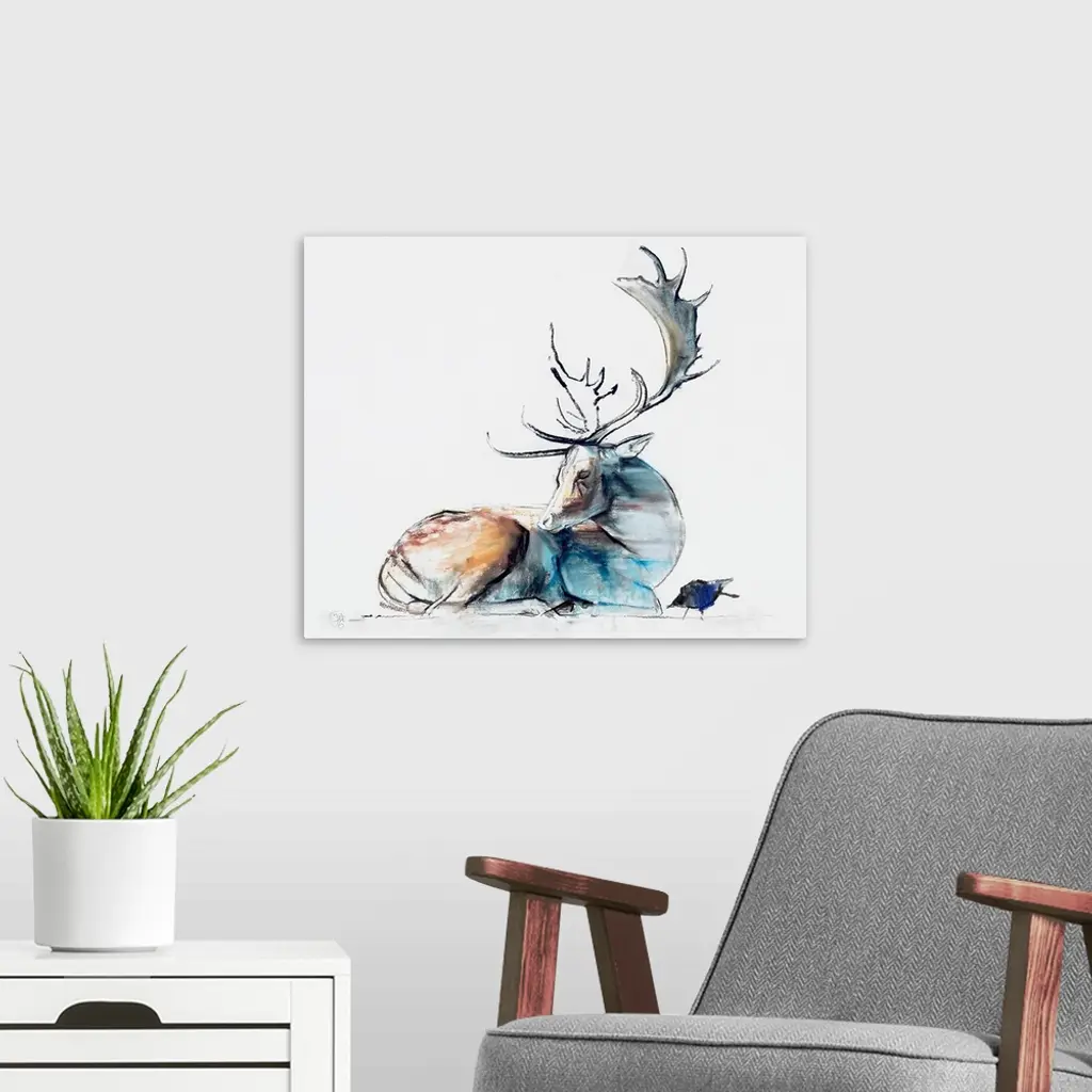 This large painting consists of a large buck curled up on the ground with a small bird just to the right of it.