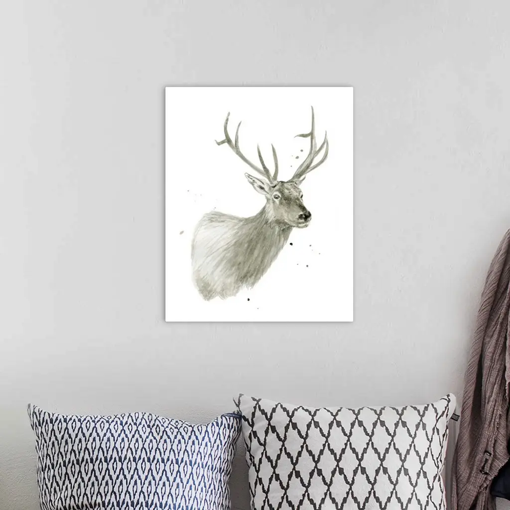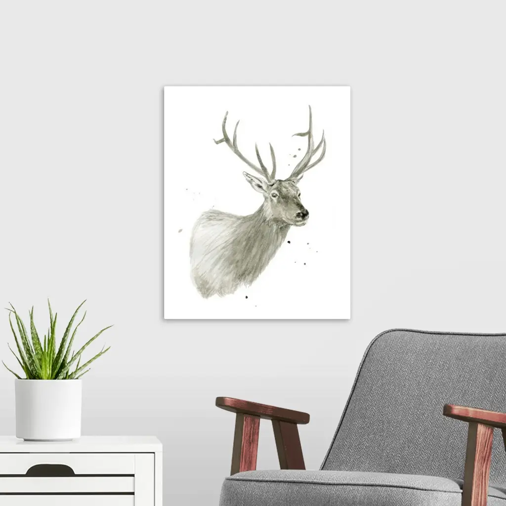 Watercolor painting of a deer on a solid white background with a little bit of paint splatter.