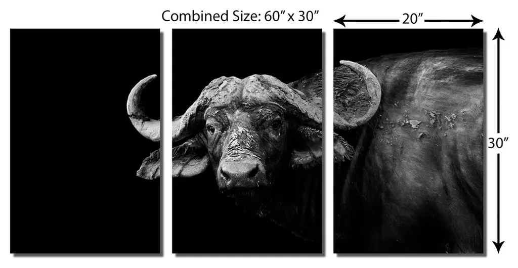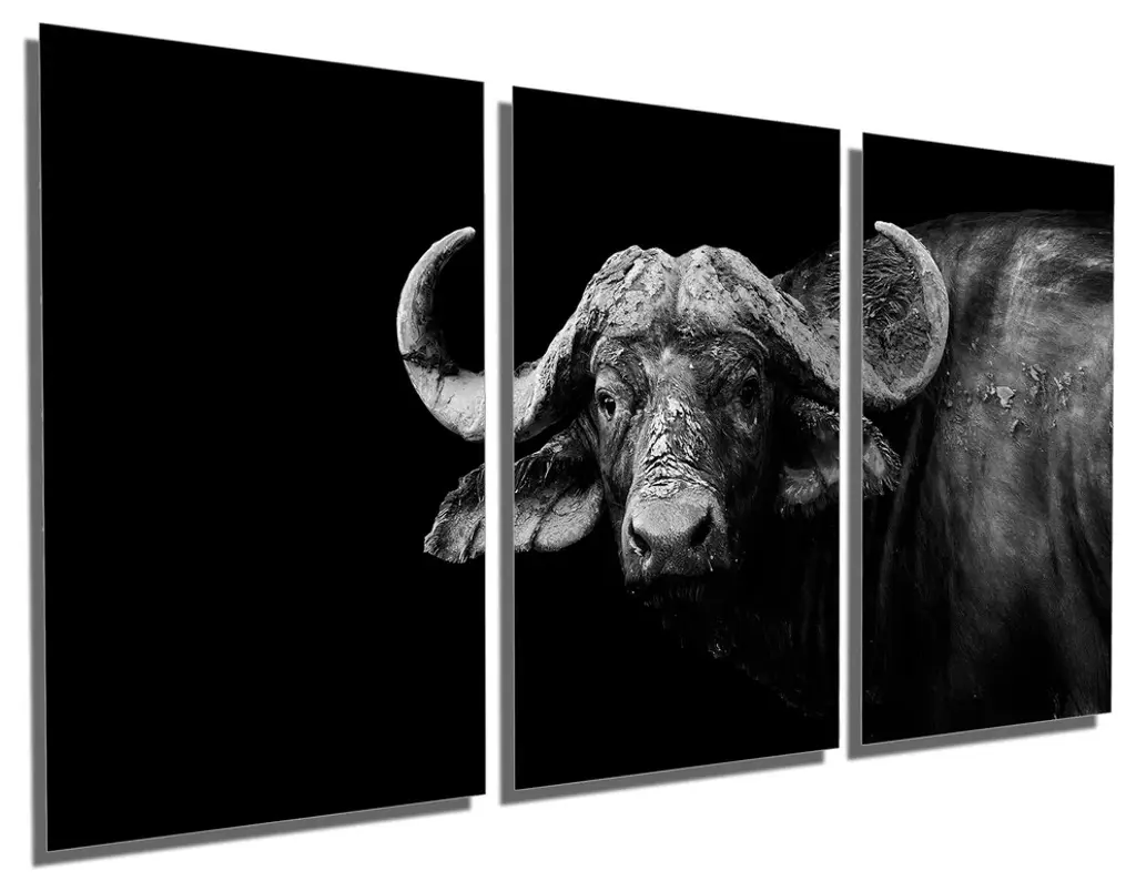 60"œ x 30"œ total size. Ready To Hang! (3 pieces - 20"œ x 30"œ each). 3 Panel Split (Triptych) Metal Print of a wild Buffalo in black and white. Modern metal wall art for home or office wall decor & interior design. Printed on Luxurious, HD aluminum glossy metal panels. Multi panel art.. HD aluminum panels. Metal print wall art. Includes Shadow Wall Mount on the back.• Aluminum Metal Wall Art• Made in USA• Ready to hang - No assembly required• Shadow mount hardware on the back• 0.045"œ thick HD Aluminum Panels• Scratch resistant, glossy finish• Superb color clarity, luxurious prints• Epson printing process• For indoor or moisture rich environment use• Easy to clean. Gently wipe with microfiber cloth.