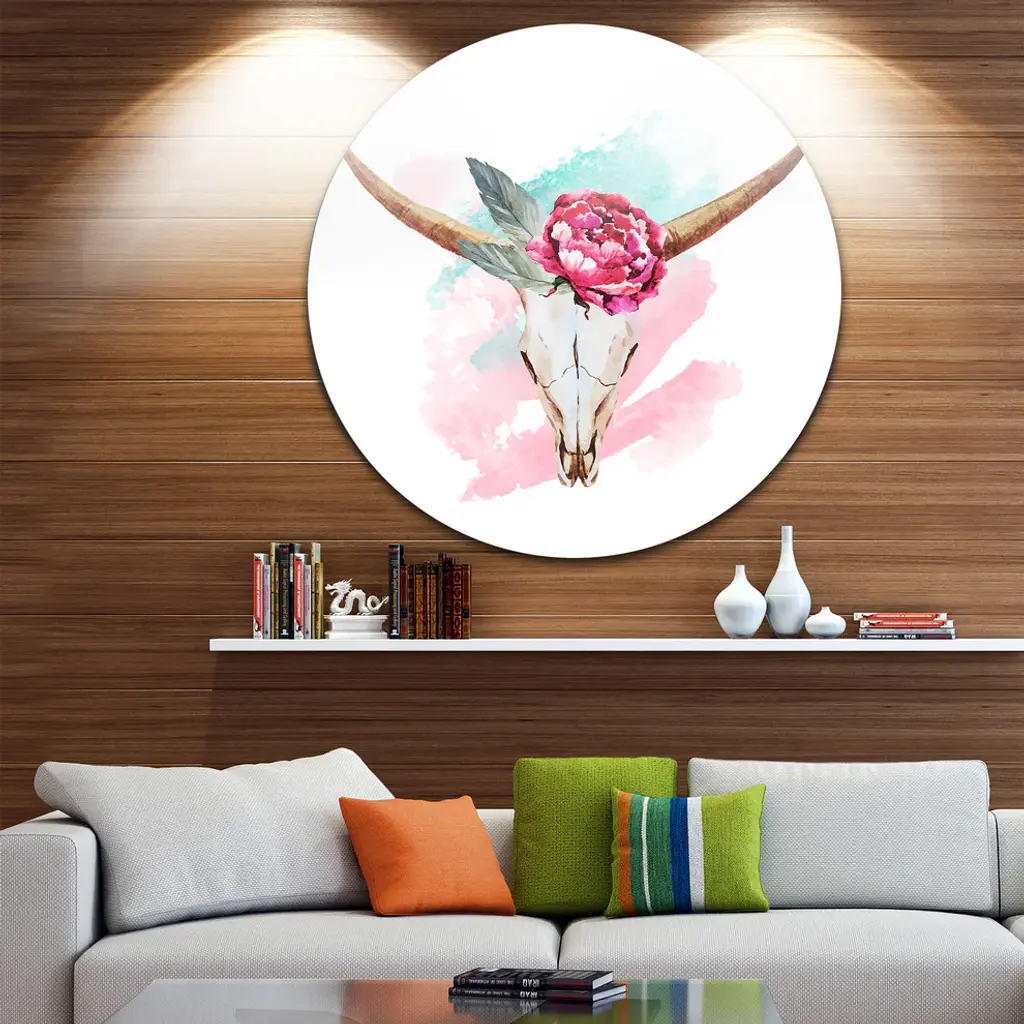 Bring Contemporary Abstraction to your home with this large Circle Metal wall art. This Bull Skull and Flower Metal Artwork makes it the focal point of any room or office. - White Gloss Coating ensures colors are extra vibrant with light reflection.- Aluminum grade Sheet Metal with 1 inch mounting frame on the back giving the illusion that the artwork is floating on the wall..- Mounting Brackets are included along with instructions.- High Quality Digital images are created directly into a glossy aluminum panel producing a stunning and captivating print into the glossy finish of the metal.- Water, Fire and Scratch resistant HD Aluminum panels.- Looks better than any photo paper and guaranteed to last at least 20 years- Easy to clean with a microfiber cloth. Colors are far superior to regular Canvas Art. - Easy to Hang
