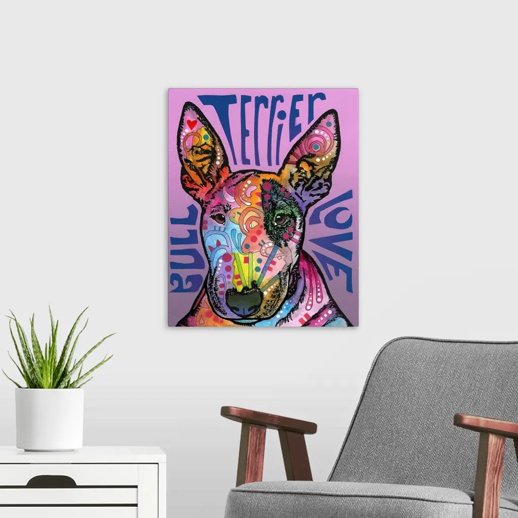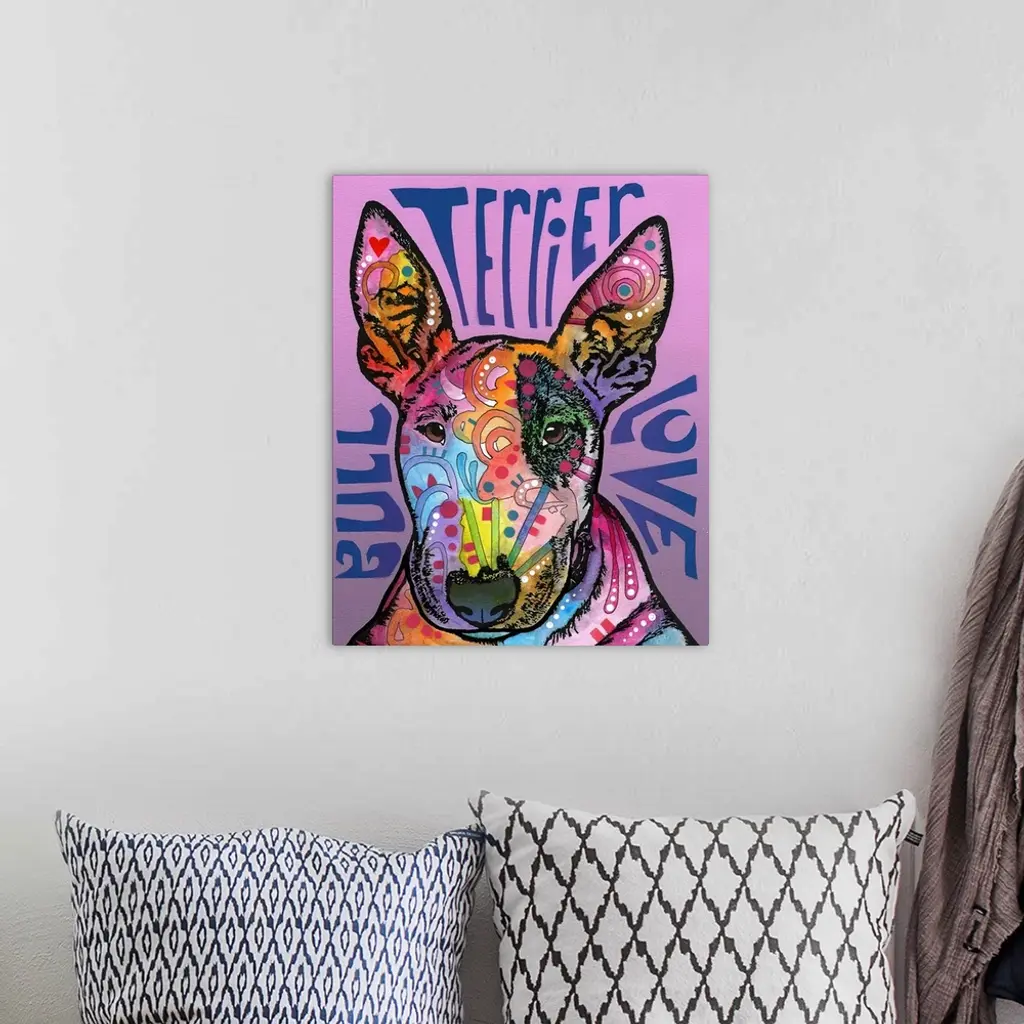 "Bull Terrier Luv" written around a colorful painting of a Bull Terrier with abstract markings on a purple background.