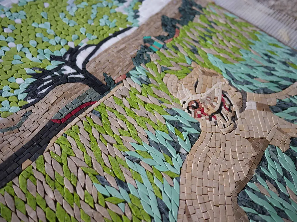 Introducing our Bulldog Art - Animal Mosaic, a stunning patterned rug that brings life and charm to any space. This exquisite handcrafted mosaic captures the pure joy of a contented bulldog lounging peacefully on lush green grass, rendered with premium quality natural stone. The vibrant colors and intricate details offer a sense of tranquility, making it an ideal addition to your luxury stone home decor. Crafted with precision, this Animal Mosaic captures the essence of a carefree moment against a soothing green backdrop. Each tile in this patterned rug is meticulously arranged to create a dynamic visual experience that draws the eye and sparks conversation. Among the exotic materials used, the dark red quartz stands out with its luminous, crystalline depth, adding a radiant jewel-like shimmer that enhances the mosaic’s captivating allure. This translucent brilliance of the dark red quartz infuses the artwork with a scintillating warmth and prismatic richness, elevating the entire piece to a new level of sophistication. Imagine this unique mosaic gracing your living room, bedroom, or office, adding a touch of whimsy while providing a cozy, inviting atmosphere. Perfect for dog lovers and art enthusiasts alike, this patterned rug serves as a celebration of life, pets, and the simple pleasures of nature. Made from the finest natural stone, this luxury stone mosaic is designed for durability and longevity, offering a silky, cool-to-the-touch surface that is easy to clean and maintain. Whether enhancing your own home or gifting it to a loved one, the Bulldog Art - Animal Mosaic is sure to impress. Elevate your interior design with this eye-catching handcrafted mosaic and transform any space into a warm, welcoming environment. Order yours today and embrace the delightful spirit of this charming bulldog while enjoying the beauty of premium exotic materials.