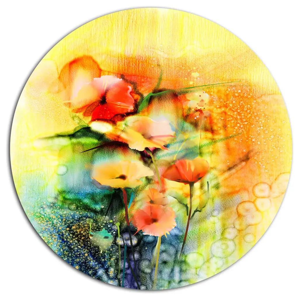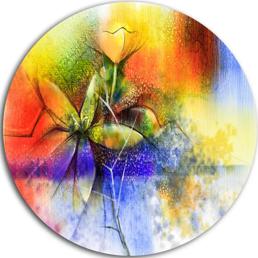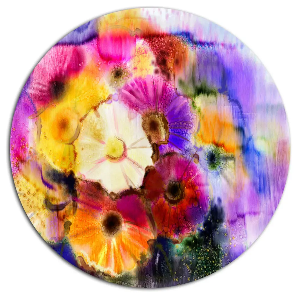 Bring Contemporary Abstraction to your home with this large Circle Metal wall art. This Bunch of Colored Daisy Flowers Metal Artwork makes it the focal point of any room or office. - White Gloss Coating ensures colors are extra vibrant with light reflection.- Aluminum grade Sheet Metal with 1 inch mounting frame on the back giving the illusion that the artwork is floating on the wall..- Mounting Brackets are included along with instructions.- High Quality Digital images are created directly into a glossy aluminum panel producing a stunning and captivating print into the glossy finish of the metal.- Water, Fire and Scratch resistant HD Aluminum panels.- Looks better than any photo paper and guaranteed to last at least 20 years- Easy to clean with a microfiber cloth. Colors are far superior to regular Canvas Art. - Easy to Hang
